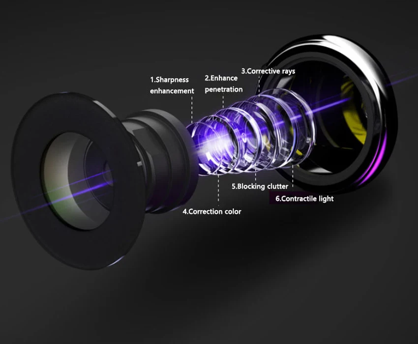 9.6 glass lens (the first layer shrinks light, the second layer corrects light, the third layer blocks clutter, the fourth layer improves penetration, the fifth layer corrects color, and the sixth layer improves sharpness)