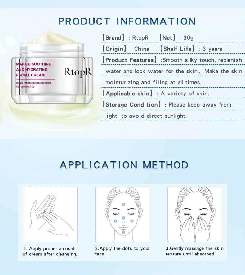 [Бренд] : RtopR [Нетто] : 30 г [Происхождение]: Китай [Срок годности] : 3 года [Особенности продукта]: гладкое Шелковистое прикосновение, пополняет воду и блокирует воду для кожи, делает кожу увлажненной и наполненной в любое время. [Подходящая кожа]: разнообразие кожи. [Состояние хранения]: пожалуйста, держите подальше от светильник, чтобы избежать прямого солнечный светильник.