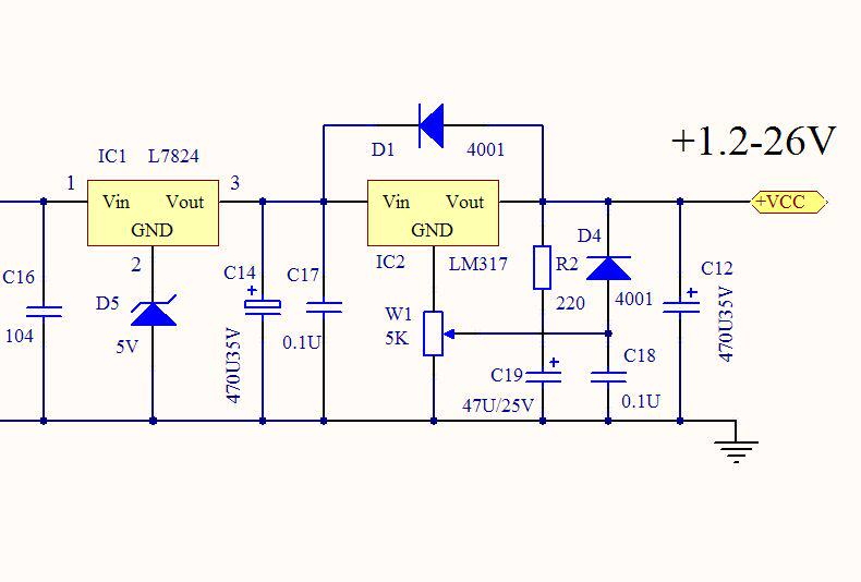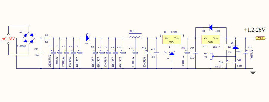 Двойная группа переменного тока (четыре линии) вход 24 В, напряжение около ± 33 в постоянного тока после бортового двухмостового исправления и фильтрации, 78 трехконтактных регулируемых выходов 29 в постоянного тока, И затем через второй этап LM317, состоящий из точной регулируемой цепи стабилизации напряжения от ± 1,2 в до ± 26 в регулируемого выхода, Точность положительного и отрицательного напряжения можно контролировать в пределах нескольких десятых вольт. Двухступенчатый регулируемый источник питания имеет очень небольшую рябь, очень чистый и выдающийся эффект.