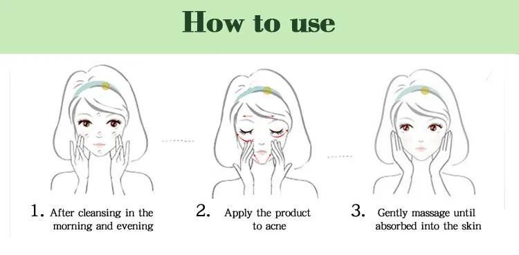 1. После очищения утром и вечером 2. Нанесите продукт на акне 3. Мягко массируйте до тех пор, пока не впитывается в кожу