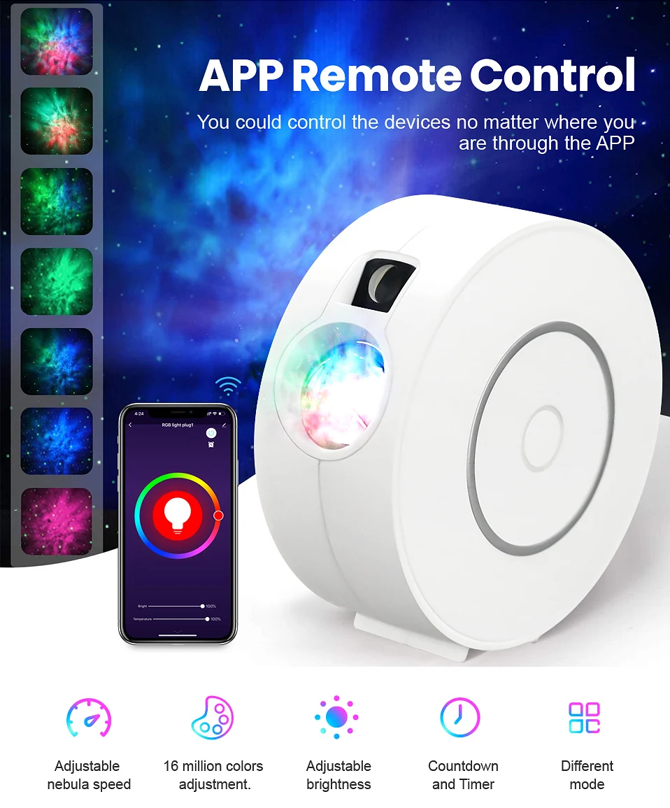 [16 миллионов цветов и различная тема на выбор]-гораздо более насыщенный цвет на выбор по сравнению с 7 цветами только традиционный Звездный проектор. SP01 имеет панель регулировки цвета в приложении, чтобы изменить цвет туманности, может установить цвет точный и уникальный в соответствии с вашими личными требованиями. Также можно установить скорость и яркость движения туманности. И он установил тему частого использования, можно выбрать тему ежедневного использования быстро и удобно.