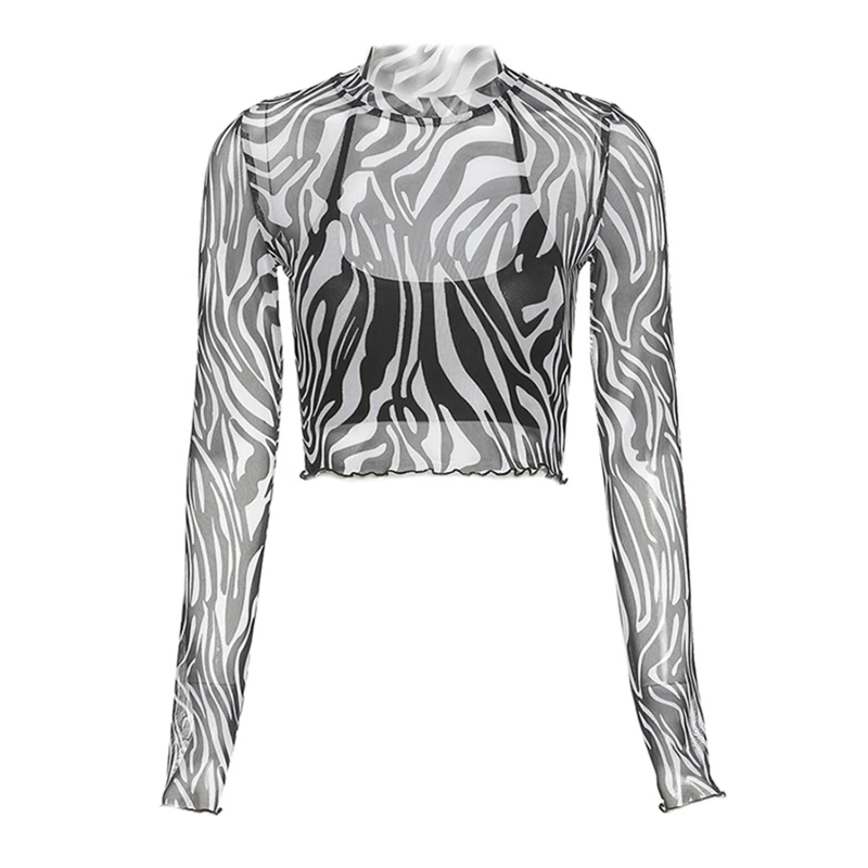 Женский сексуальный укороченный топ из 2 предметов с длинными рукавами и черной бретелькой через шею, Harajuku, полосатая футболка с принтом зебры, тонкая Сетчатая футболка в уличном стиле