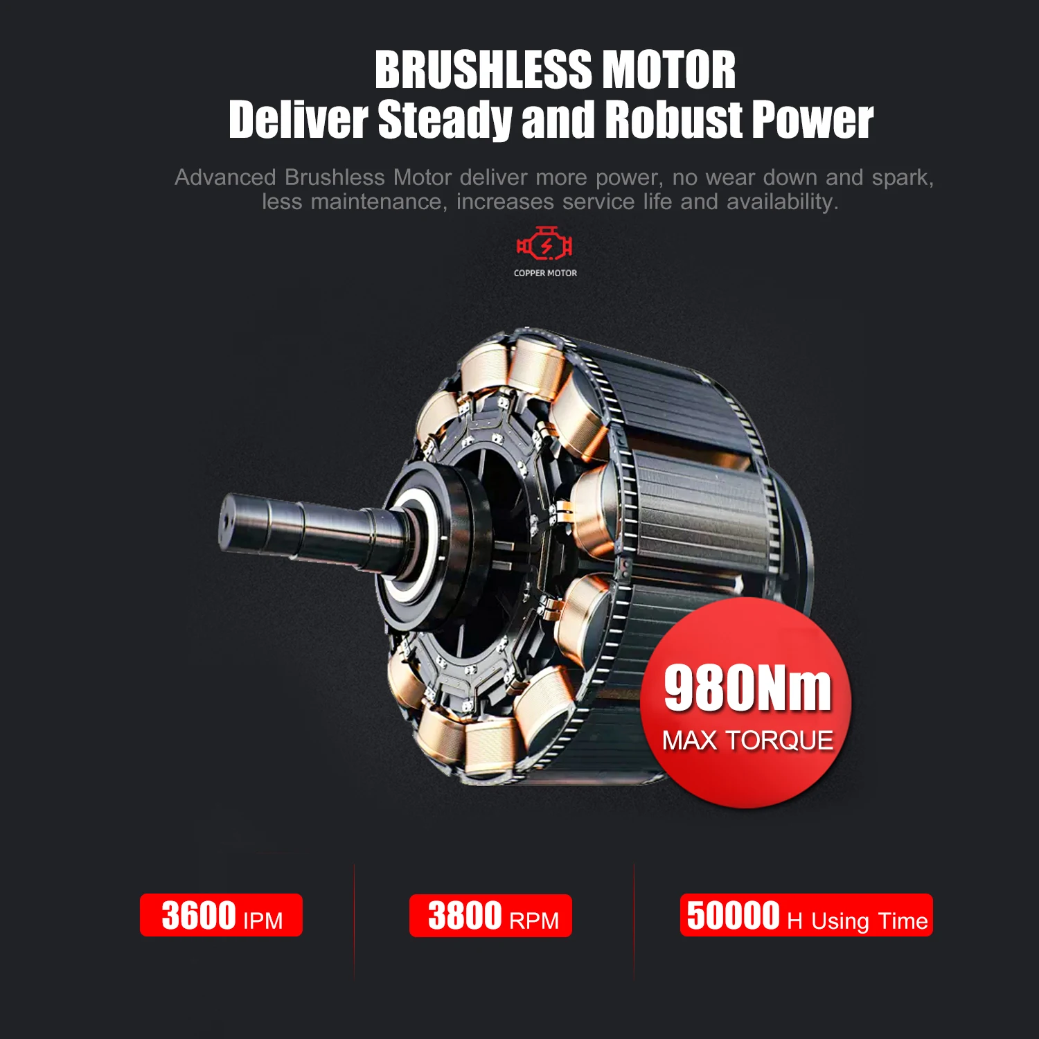 Мощный бесщеточный двигатель-высокопроизводительный бесщеточный двигатель обеспечивает крутящий момент до 980нм (8674 дюйма в фунтах) для легкого ослабления/затягивания любых ржавчины или более затянутых гаек, болтов или большого винта; он также может оптимизировать эффективность машины, увеличивает срок службы двигателя 10X и на 50% больше времени работы за заряд по сравнению с матовым двигателем.
