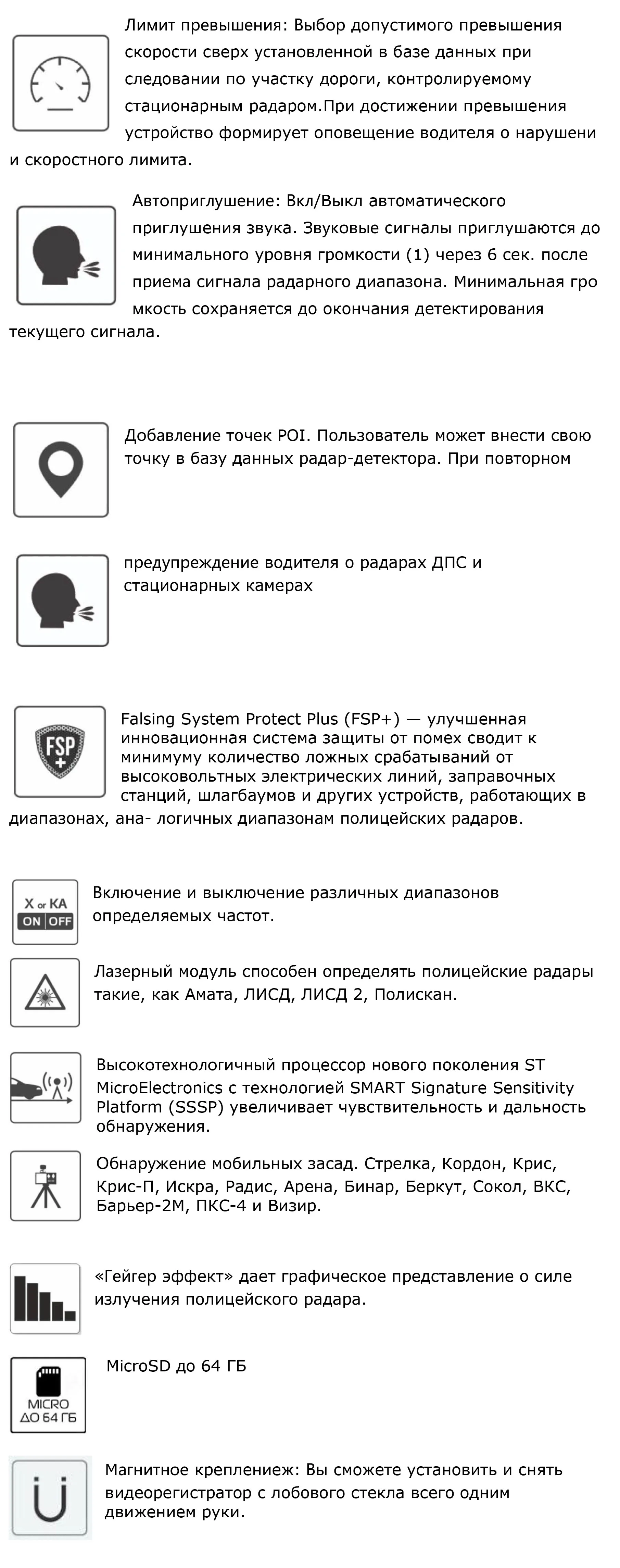 Узлов); свыше 71 км/ч - включается режим “Трасса” (улучшенная светочувствительность обнаружения узких радаров).