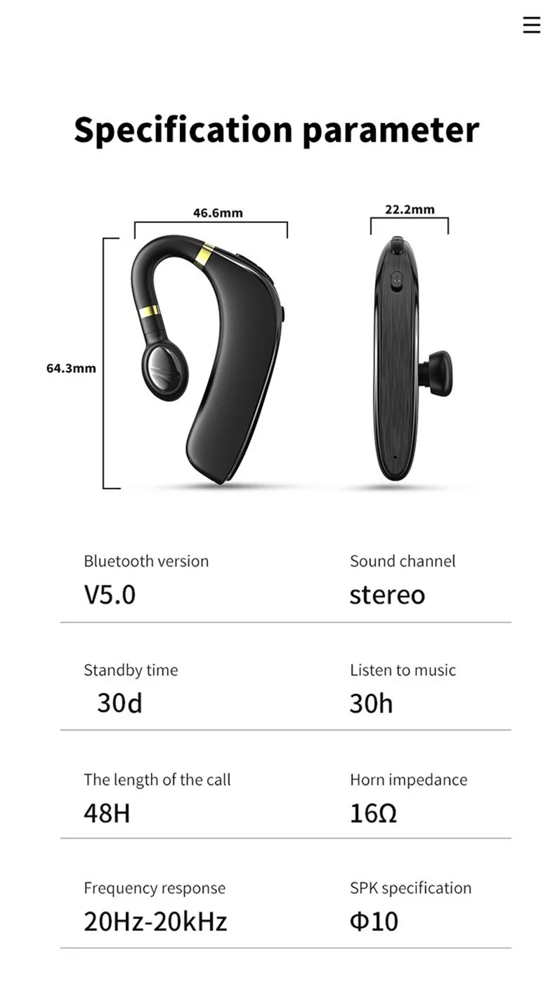 Примечание: 1. По соображениям безопасности рекомендуется не использовать гарнитуру во время зарядки 2. Если Выход зарядного устройства для вашей гарнитуры превышает 5 В, это может повредить вашу гарнитуру. Рекомендуется использовать стандартное зарядное устройство для вашей гарнитуры Основные характеристики: Гарнитура без рук: Эта гарнитура-это настоящая bluetooth-гарнитура без рук, которая позволяет вам действительно выпускать Ваши руки во время вождения, работы, занятий спортом, и это очень удобно. Идеальный компаньон для бизнес-гарнитуры: Гарнитура является идеальным компаньоном для деловых гарнитур, с двумя различными размерами силиконовых затычек для ушей, Режим глубокого сна энергосбережения, с помощью технологии шумоподавления CVC6.0, чтобы гарантировать, что Звоните в шумную среду, чистое качество; Оснащен кнопкой отключения звука, поддерживает отключение микрофона, если вы не хотите, чтобы другой человек вас услышал. Простой и удобный: 180 градусов вращающийся ушной крючок используется для левых и правых ушей, вы можете найти больше 1. Зарядная коробка: перезаряжаемый литий-полимерный аккумулятор 1500 мАч 2. Его можно использовать для зарядки гарнитуры 5 раз, что удобно носить с собой и защищать наушники от повреждений.