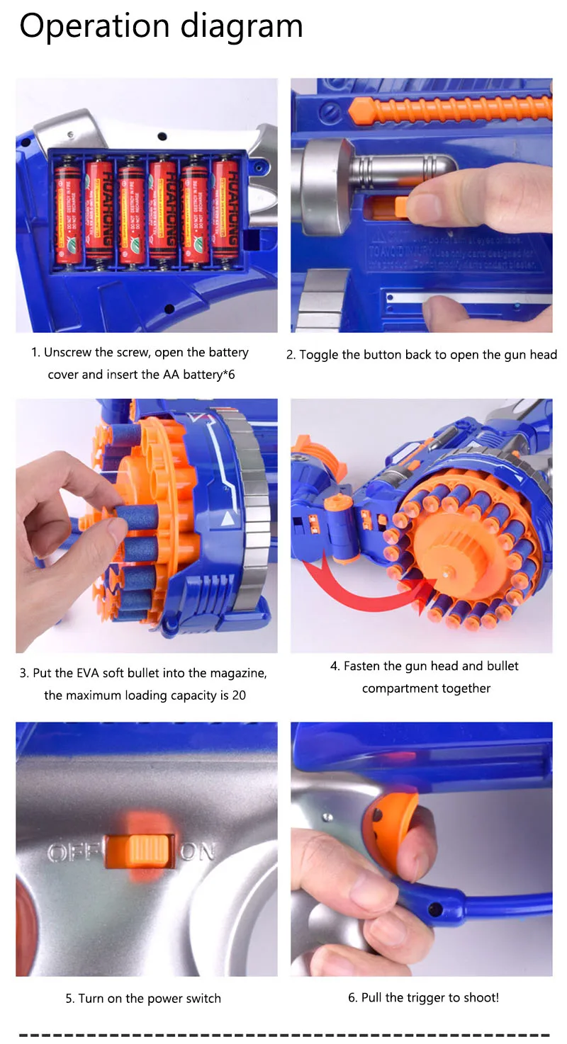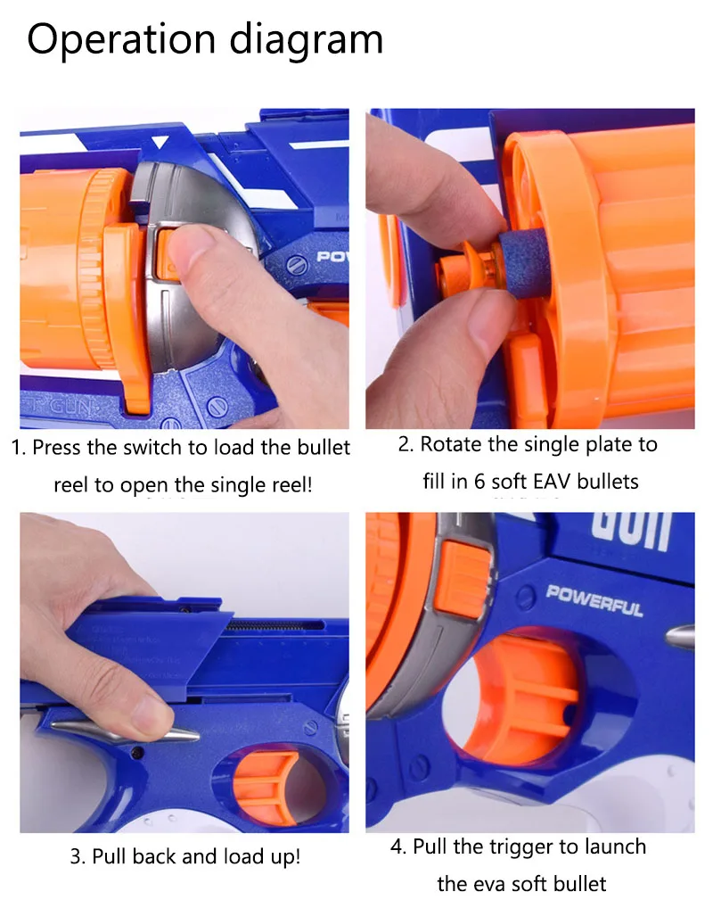 Рулетка страйкбола Размер пистолета: 57*25 см Батарея: АА батарея * 6 диапазон: 5-10 метров продукты включают: рулетка страйкбола пистолет * 1, EVA Мягкая Пуля * 40, цель * 1 M16 электрическое Страйкбольное Оружие Размеры: 79*27,5 см Батарея: AA Батарея * 4 диапазон: 5-10 метров продукция включает в себя: M16 электрическое Страйкбольное Оружие, Ева мягкая пуля * 20 Цель * 1 револьвер страйкбола Размер пистолета: 30*18 см Батарея: без батареи требуемый диапазон продукта: 5-10 метров максимальное количество бомб: 6 продуктов включают: револьвер страйкбола пистолет * 1, EVA Мягкая Пуля * 10
