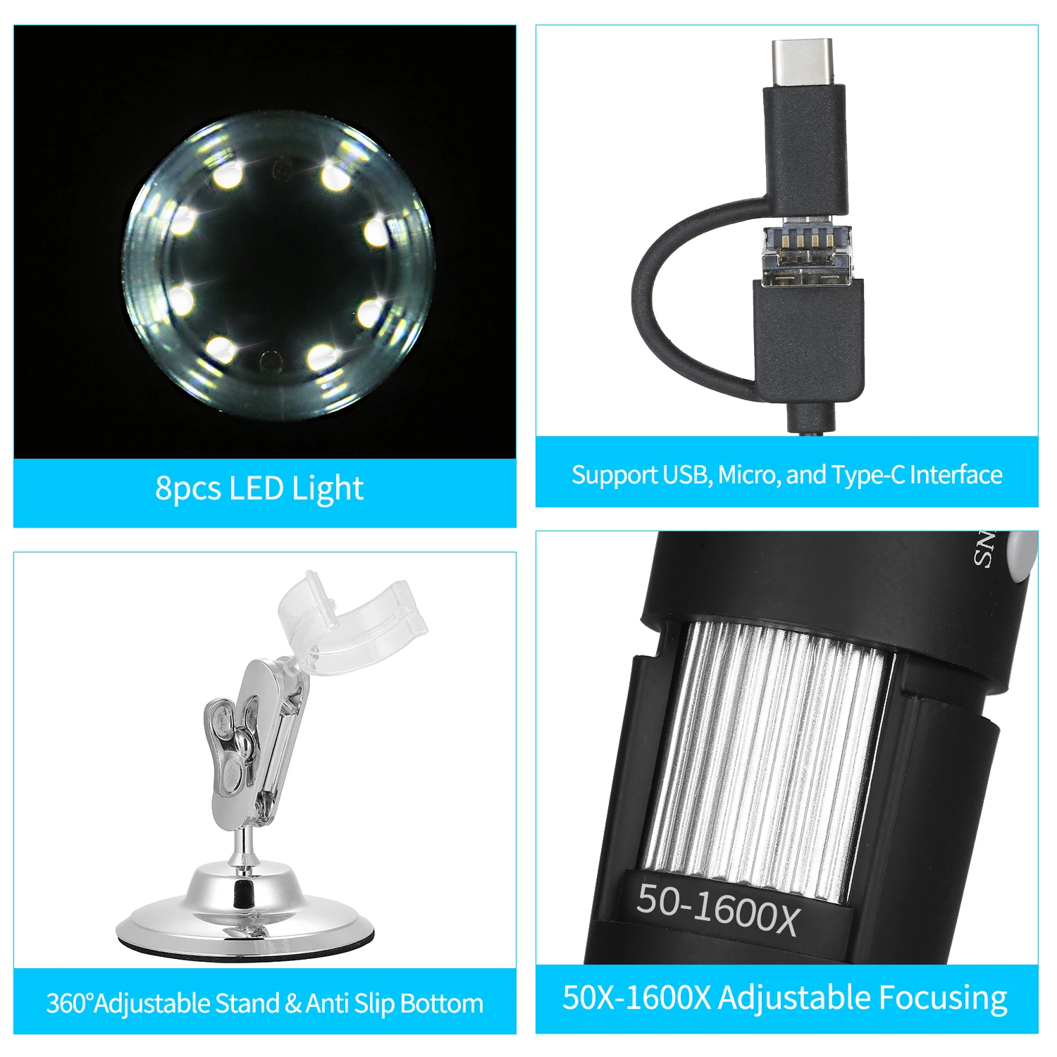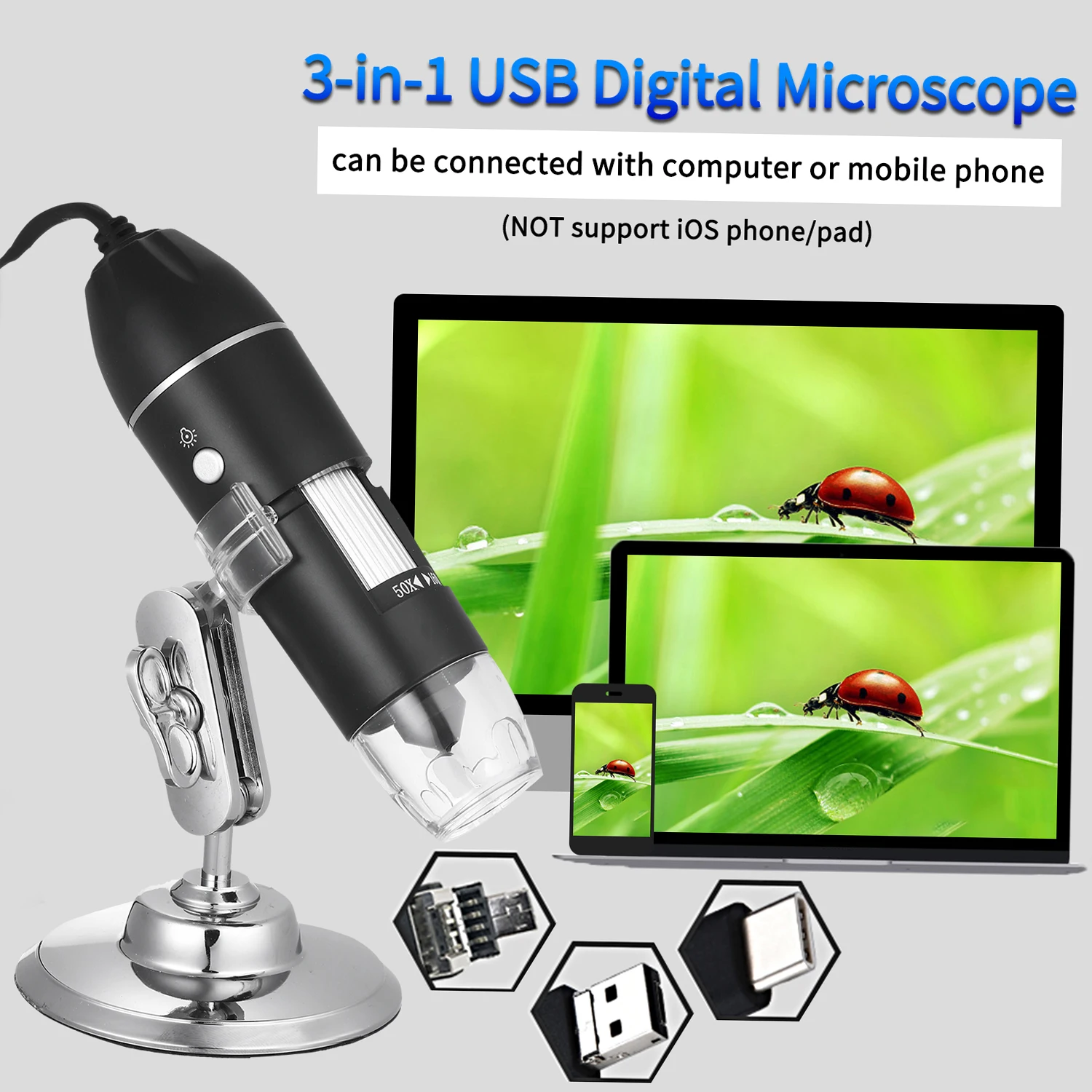 Микроскоп может быть подключен к компьютеру или мобильный телефон через usb-порт, порт micro USB или type-c, удобно использовать на устройстве OTG Android (5,0 и выше), планшете, Windows, совместимость с ПК iOS, нет необходимости в дополнительном адаптере. (Не совместим с портативным устройством iOS)