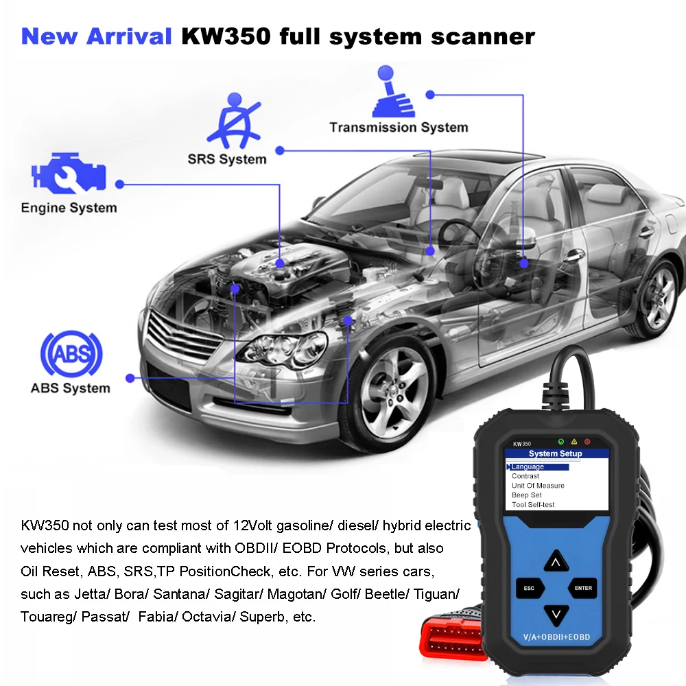 Он может протестировать большинство 12 в бензиновых/дизельных/гибридных электромобилей, которые совместимы с протоколами OBDII/EOBD. Для автомобилей серии VW, таких как Jetta/Bora/Santana/Sagitar/Magotan/Golf/Bee-tle/Tiguan/Toua-reg/Passat/Fabia/Octavia/Superb и т. д.