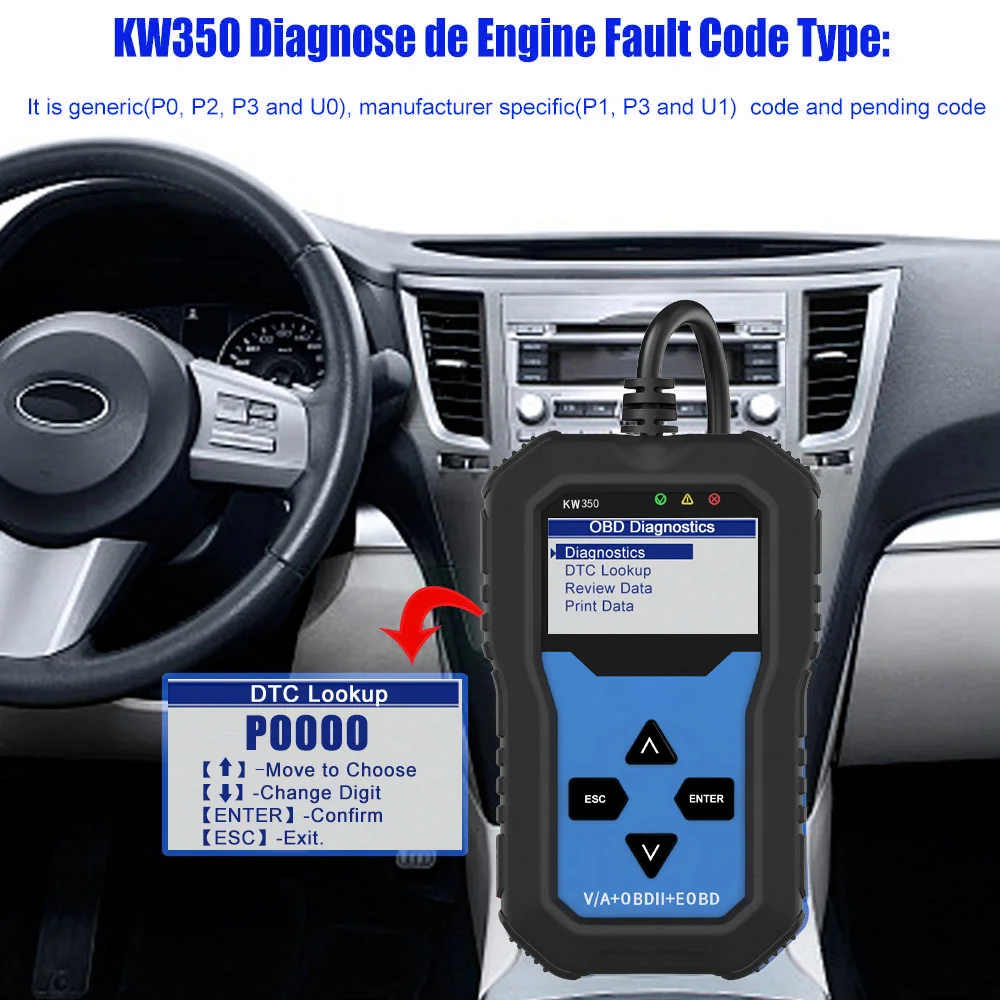 Оснащен большим простым в считывании ЖК-экраном с подсветкой, многоязычным меню и определениями DTC и стандартным разъемом OBD II; Дополнительные кабели не требуются.