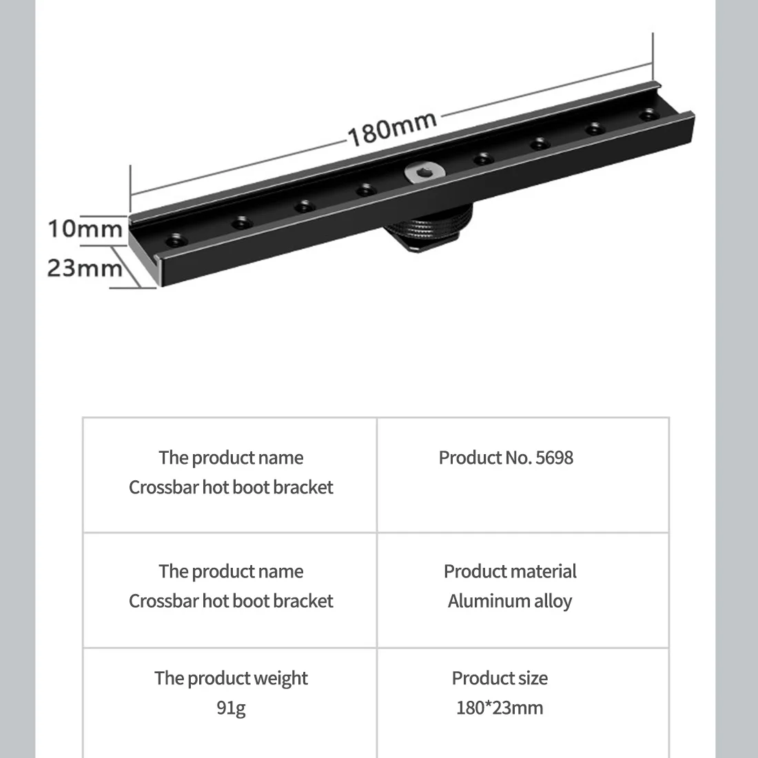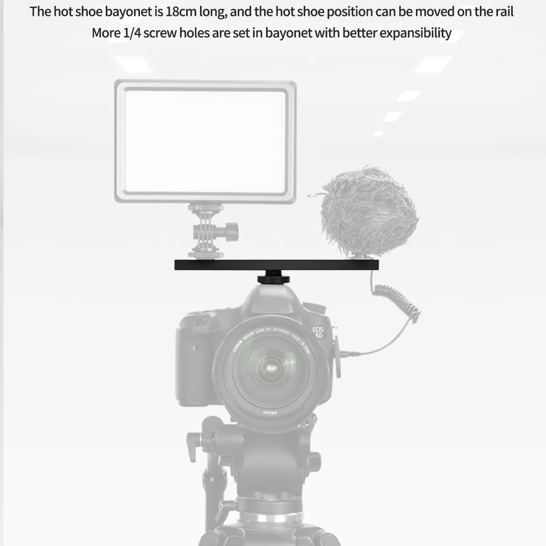 Очень длинная Пряжка для горячего башмака длиной 18 см, положение горячего башмака на рельсе может быть перемещено, а Пряжка снабжена несколькими резьбовыми отверстиями 1/4 для большего расширения.