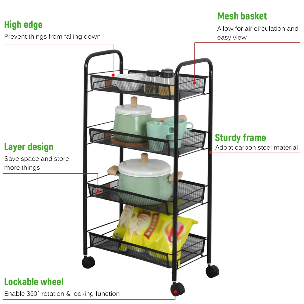 Mesh Baskets: It adopts mesh basket shaped shelves with high edge, perfectly prevents the items on the cart from falling, allows for air circulation to keep them away from moisture. Also such open design lets you find and get what you need quickly.