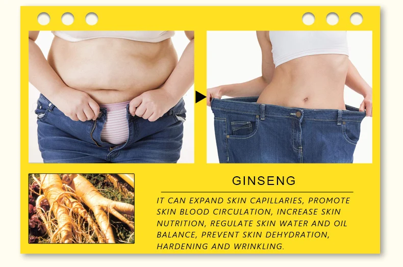 Экстракт женьшеня идеально сочетается с гиалуроновой кислотой, содержит множество смягчающих веществ для тела, мягкую текстуру, которая легко проникает и поглощает, при подъеме и подтягивании, полностью сжигает жир, после непрерывного использования, корректирует идеальные линии талии и ног.