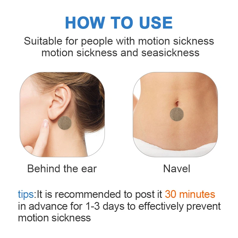 Название продукта: Пластырь от укачивания в транспорте Хранение: хранение в прохладном и сухом месте Срок действия: до 3 летМатериал: травяная медицина, Нетканая ткань Использование: Оторвите защитный слой, наклейте клейкую поверхность на виски, большие отверстия позвоночника или на основание двойных ушей. После непрерывного использования двух постов Используйте третью почту через 6 часов. Сфера применения: Укачивание, морская тоска, Воздушная болезни, вызванные головокружением, недомоганием и рвотой. Меры предосторожности: Аллергия на кожу и повреждения кожи не используются. Если есть какие-либо дискомфорта, удалите пластырь и выпейте больше воды, и сделайте отдых. Особенности:1) маленький и легкий, подходит для ношения в кармане, школьной сумке или чемодане.2) натуральные растительные ингредиенты безвредны для человеческого организма.3) содержит 2/8/20 шт Патч-пакетов для болезни при движении.4) подходит для людей, которые болеют во время длительных поездок.5) простой и безопасный в использовании, без побочных эффектов. Эффективность:1. Регулируйте контроль за желудочно-кишечный блуждающий нерв и подавляйте движение желудочно-кишечной системы, тем самым предотвращая рвоту и рвоту.2. Расширяя кожу/капилляры, улучшая микроциркуляцию тела/и увеличивая количество кислорода в головном мозге, это влияет на охлаждение головного мозга.3. Облегчает рвоту, рвоту, головокружение, анорексию и другие признаки, вызванные автомобилями, кораблями, самолетами, поездами и другими видами транспорта.4. Патч от болезни движения не легко отпасть. Инструкции по уходу за изделием1. Снимите защитный слой накладки и приклейте клейкий слой к задней части пупка или уха.2. Один патч за раз.3. За десять минут до поездки, эффект каждого патча будет длиться от 6 часов до 1 дня Примечание: Избегайте использования на аллергической и поврежденной коже