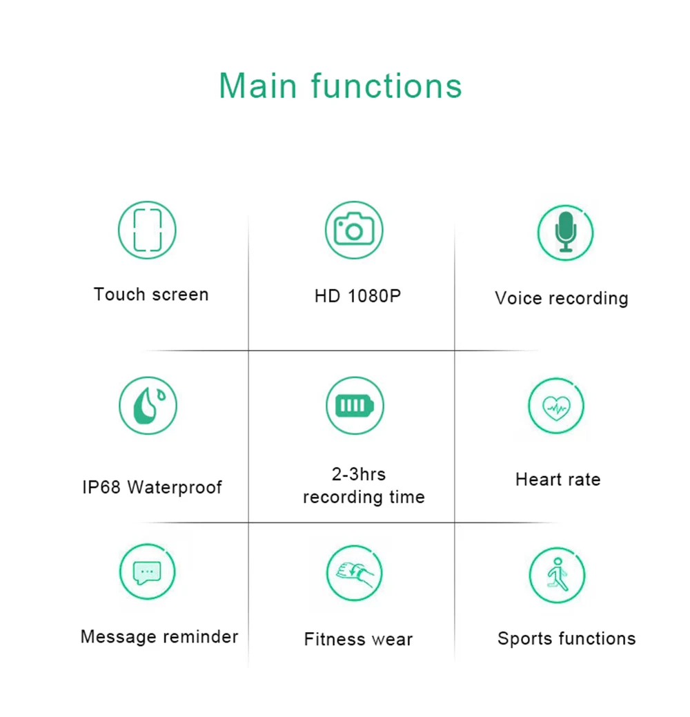 [Отслеживает шаги]Запись и отслеживание шагов.[Трекер сердечного ритма и измерение артериального давления]Отслеживайте сердцебиение 24 часа. НоОбратите внимание: измерение артериального давления только для справки, потому что оно не может достичь медицинской точности.[Управление потреблением калорий]Рассчитать потребление калорий, записать ежедневную сжигание калорий.[Спортивный режим]Несколько спортивных режимов, таких как бег, прогулки, езда.[Отображение времени]Синхронизация смартфона с цифровым дисплеем светодиодный индикатор времени.[Напоминание о здоровье]Напоминание о питье, сидя слишком долго.[Напоминание о звонке]Когда входящие звонки не будут отвечены в определенное время, умный Браслет напомнит вам вибрацией fornСистема Android и iOS.[Напоминание о sms-сообщениях]В тех случаях, когда пришло новое сообщение, смарт-браслет будет напоминать вам показать, в том, что чехол вы не пропустите ни одного своевременное сообщение fornСистема Android и iOS.Характеристики:Цвета на выбор: черныйДополнительный объем внутренней памяти: встроенная память 32 ГБ/64 Гб/128 ГБ/256 ГБ на выборФормат видео: AVI/M-JPEGФормат звука: WAVЭкран: 0,96 дюймов OLED цветной сенсорный экранАккумулятор: 350 мАчРазрешение видео:1920*1080(1080P)@ 30fpsФункции: Цифровой диктофон, камера, видеокамера; Спортивный шагомер, трекер сердечного ритма, отображение времениДисплей: Время, дата, шаги, расстояние (км), калорииПосылка включает:1 * смарт-браслет мини-камера1 * Руководство пользователяФлуоресцентный