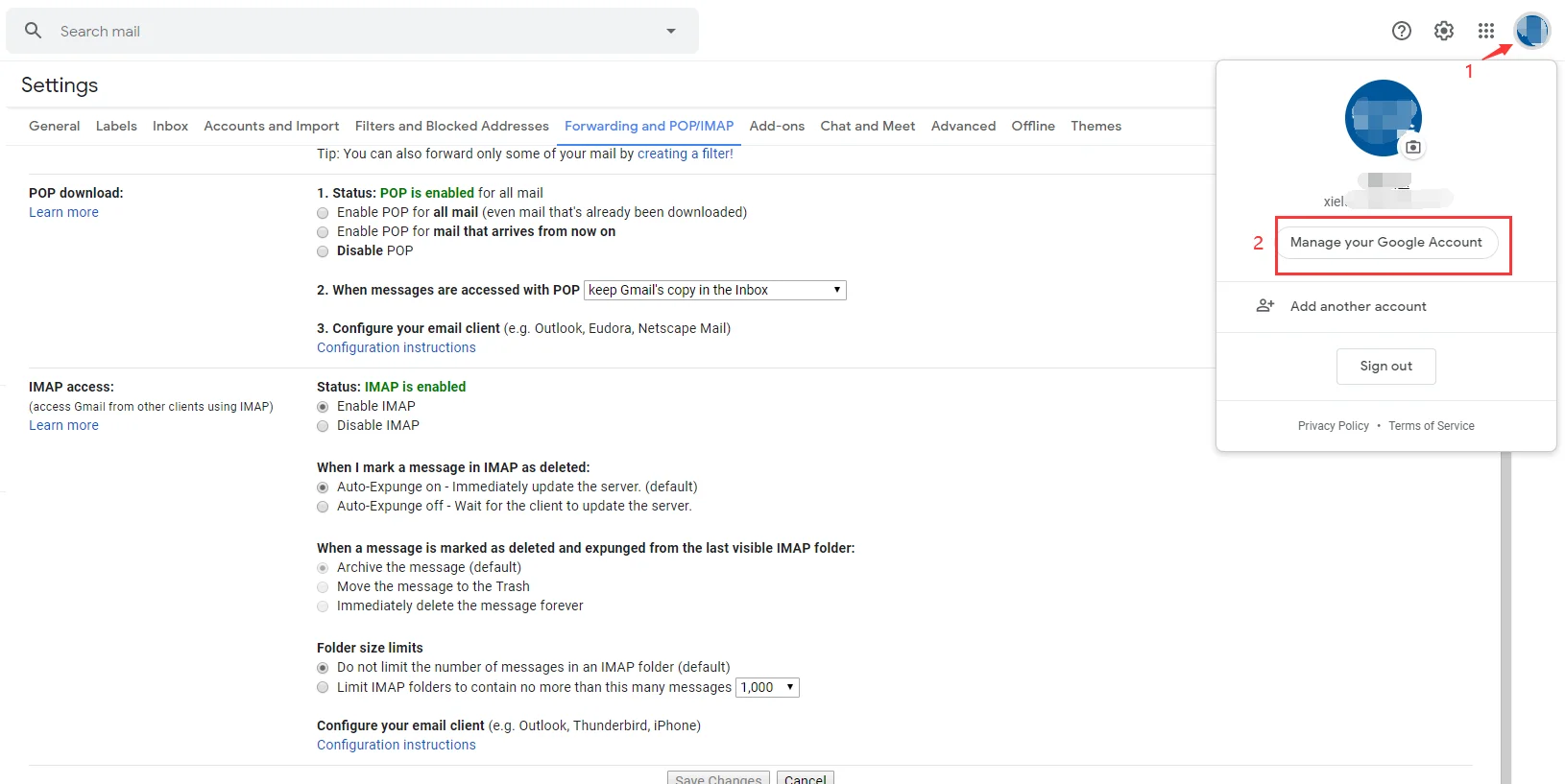 (1)Войдите в Gmail, чтобы задать путь -- Пересылка и POP/IMAP ---Включите POE и IMAP--- Сохранить.
