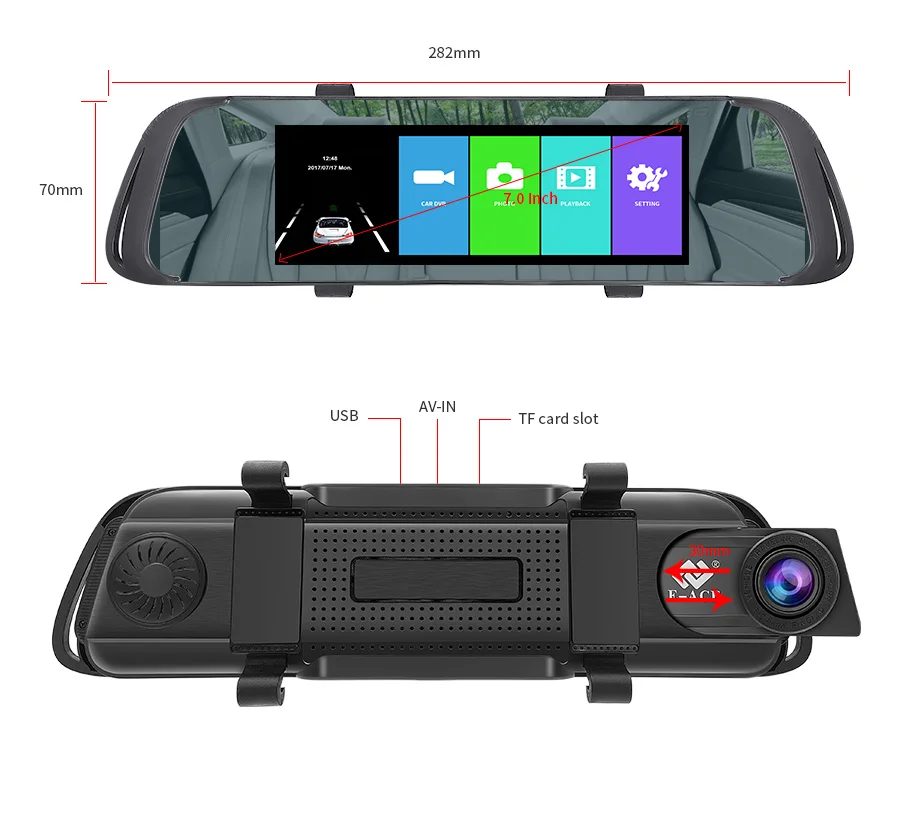 Он поддерживает два объектива камеры, объектив фронтальной камеры составляет около 170 Drgree широкоугольный, а объектив задней камеры-около 140 градусов. Поддержка изображения на дисплее, два объектива камеры записываются одновременно, все видео сохраняют в TF-карте. При движении задним ходом видеорегистратор автоматически перевернет изображение назад.