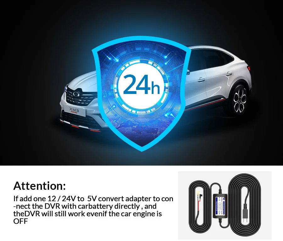 Если вы беспокоитесь о том, что ваш автомобиль был поврежден человеком после парковки, вы можете использовать нашу линию buck для подключения видеорегистратора, чтобы убедиться, что регистратор работает 24 часа. Если кто-то другой повредит ваш автомобиль и удар срабатывает g-сенсор, видеорегистратор сразу включится и записывает ситуацию.