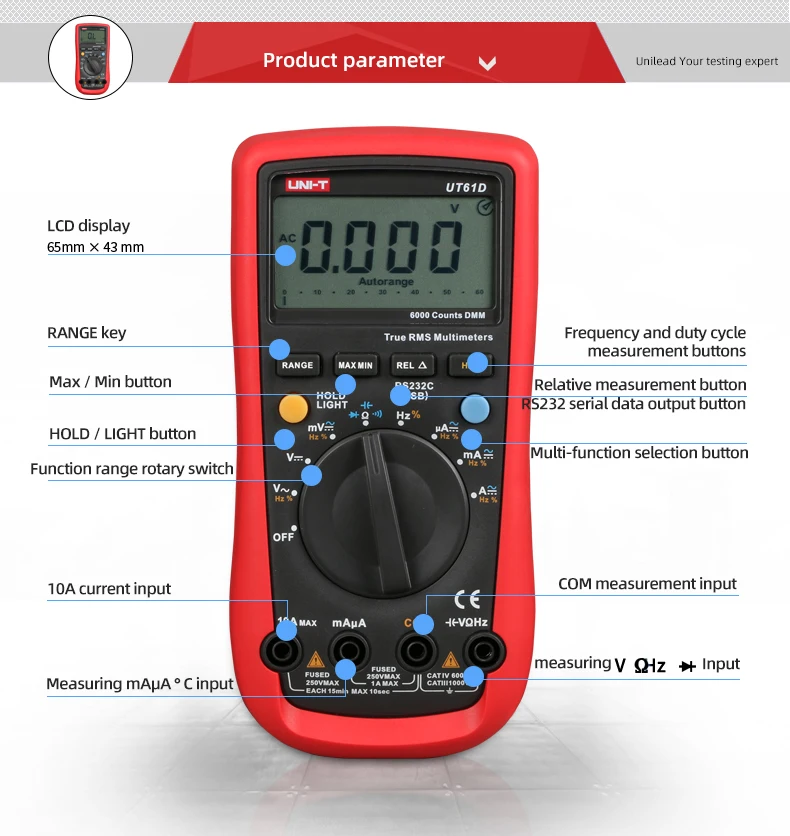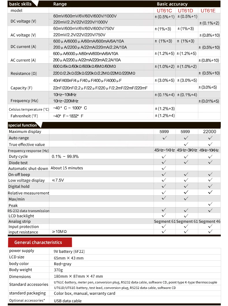 Батарея, Тестовые провода, многоцелевая розетка, RS-232 кабель интерфейса, ПК программное обеспечение CD