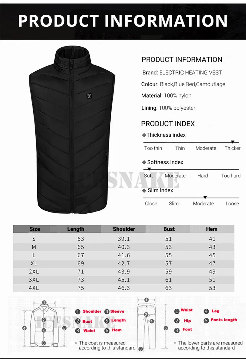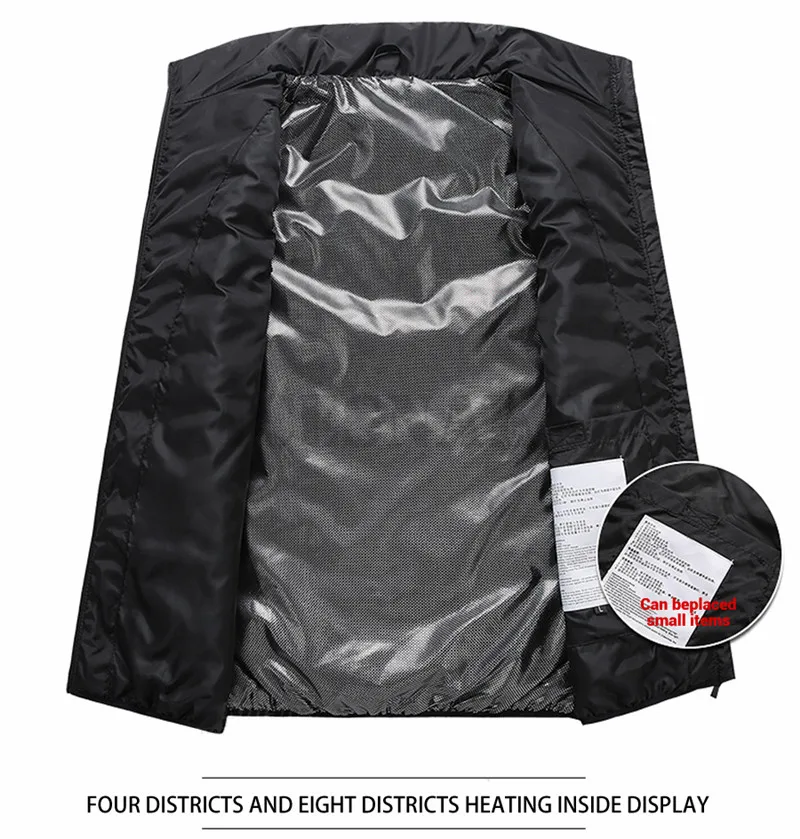 Особенности:Одна минута быстрого нагрева, рассеивания холода и сохранения тепла.Установите температуру, которую вы хотите ответить на различные среды.Одна кнопка для нагрева, три стойла контроля температуры, интеллектуальное отопление.Его можно стирать в машине и стирать вручную. Не отжимайте его вручную.Общий источник питания с интерфейсом USB, более длительный срок службы, защита от брызг воды и моющаяся.Мода теплая, удобная и дышащая, и это хороший партнер для вашего зимнего выхода. Спецификация:Название: жилет с подогревомСостояние: абсолютно новыйЦвет: черный, синий, красный, камуфляжПол: мужчин, wo мужчинИнтерфейс источника питания: USBИсточник питания: 5 В/2 а Мобильная мощность (не входит в комплект)Функция: сохраняет тепло, водонепроницаемость, холодную защитуИзменение температуры: (ручная регулировка)Теплый: 45 ℃ (красный светильник)Комфорт: 35 ℃ (белый светильник)Энергосбережение: 25 ℃ (синий светильник)Размер: S/M/L/XL/2XL/3XL/4XLСезон: Осень, Зима