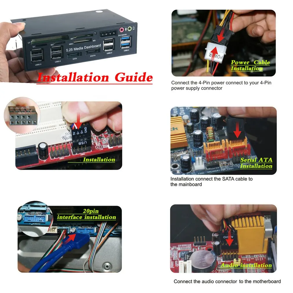 5,25 дюймов медиа приборная панель передняя панель USB3.0 + 3 порта USB 2,0 концентратор + eSATA + SATA + M2/TF/SD/MMC/MS/CF аудио мультикард-ридер для компьютера чехол для оптических дисков Bay.