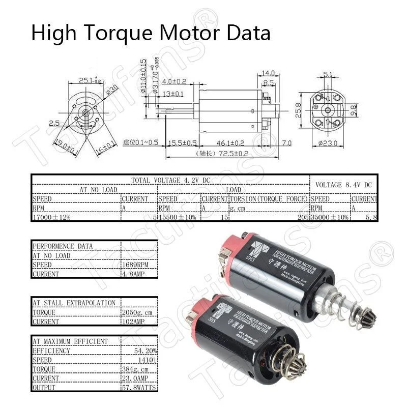SHS высокий крутящий момент двигателя является отличным двигателем, если вы хотите использовать более тяжелую весну в вашем AEG страйкбола пистолет. Кроме того, высокий крутящий момент даст более быстрый отклик триггера и поможет от перегрева двигателя при использовании 120 или более низкой пружины.