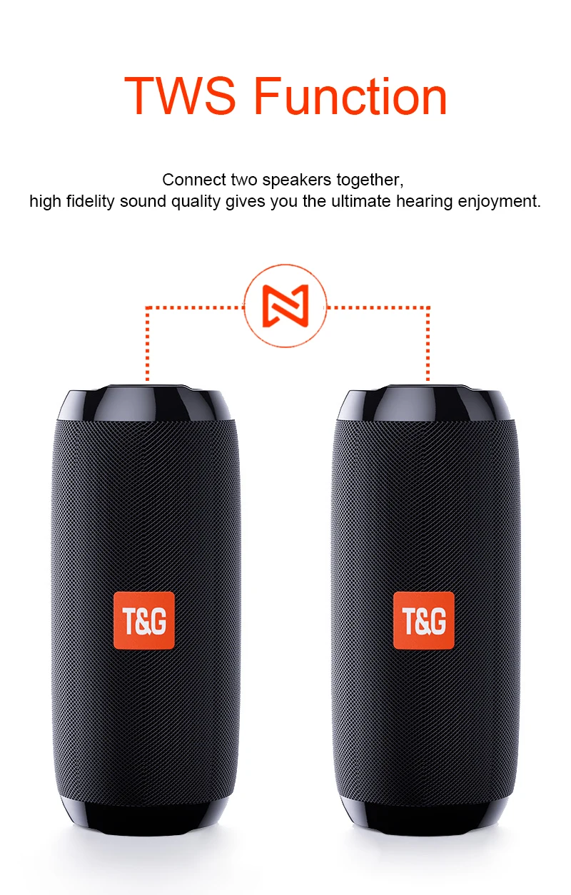 Bluetooth Version: V4.2 Output power: 10W PMPO: 10W Built in Voltage: 3.7V Frequencey Response: 150HZ-20KHZ Play Mode: Bluetooth, AUX, TF Cards Size: 75.5 X 75.5 X 161.6mm Signal-to-noise ratio: ≥90DB Battery Capacity: 1200mAH Charging Voltage: 5V/500mA Play time: 6-8H Pacage included 1 * Bluetooth Speaker 1 * USB Charge Cable 1 * AUX Cable 1 * Manual Instruction TG117