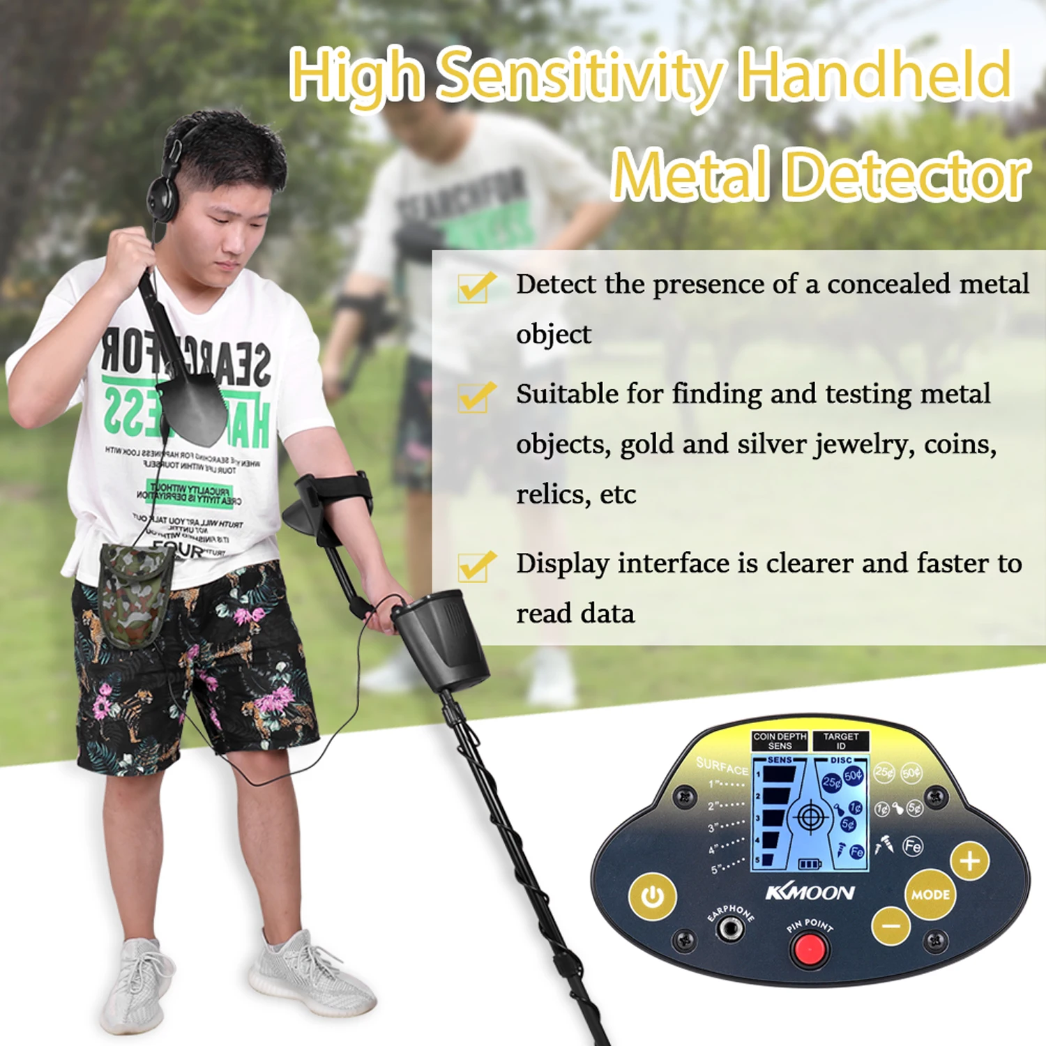 С помощью металлоискателя вы можете охотиться за монетами, реликвиями, ювелирными изделиями, золотом и серебром где угодно, включая газоны, снег, горы и т. д. Детектор обладает высокой чувствительностью и высокой способностью к дискриминации. Он универсален и прост в использовании.
