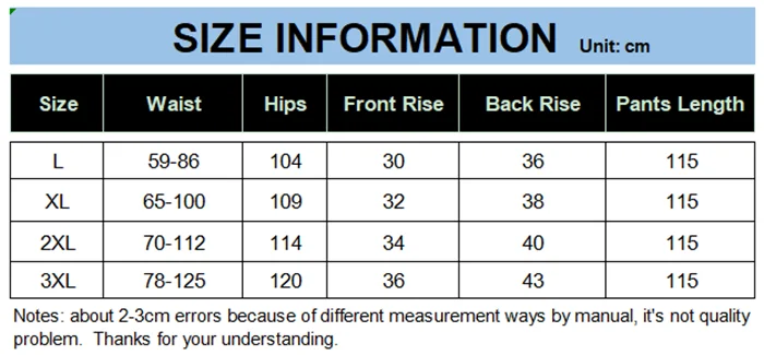 Пожалуйста, выберите размер в соответствии с длиной талии, бедер и брюк.