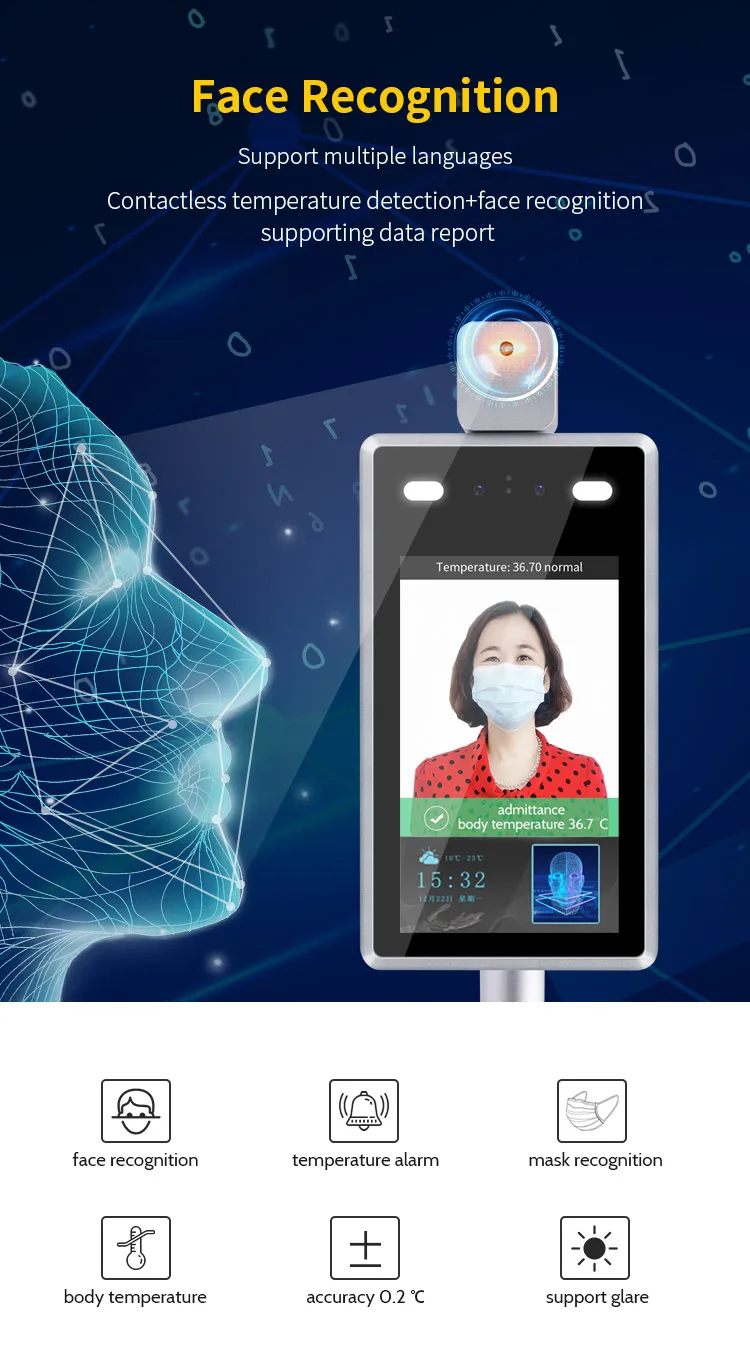 → Бесконтактное автоматическое обнаружение температуры тела, кисть для лица человека и выполнить Высокоточный инфракрасный сбор температуры человека в то же время, быстро и эффективно; → Диапазон измерения температуры 30-45 (℃) точность ± 0,5 (℃) → Автоматическое определение людей без масок и предупреждение в режиме реального времени; → Поддержка измерения температуры на дальнем расстоянии и раннее предупреждение о высокой температуре в режиме реального времени; → Автоматическая регистрация и запись информации, предотвращение ручной работы, повышение эффективности и уменьшение недостающей информации; → Поддержка бинокулярного прямого обнаружения → Уникальный алгоритм распознавания лиц точно распознает лицо, а время распознавания лица составляет менее 500 мс → Поддержка экспозиции отслеживания движения человека в сильной среде подсветки, поддержка оптической динамики машинного видения ≥ 80 дБ; → 7-дюймовый сенсорный экран IPS HD дисплей и поддержкой Multipoint и обнаружения → Защита от пыли и воды IP34 → Поддержка 22400 библиотеки сравнения лиц и 100000 записей распознавания лиц → Поддерживает один Wiegand вход или Wiegand выход → Поддержка электронного голосового вещания (нормальные характеристики температуры человеческого тела или сверхвысокий сигнал тревоги, результаты проверки распознавания лица) → Долгосрочная стабильная работа в среде от 0 ℃ до + 50 ℃