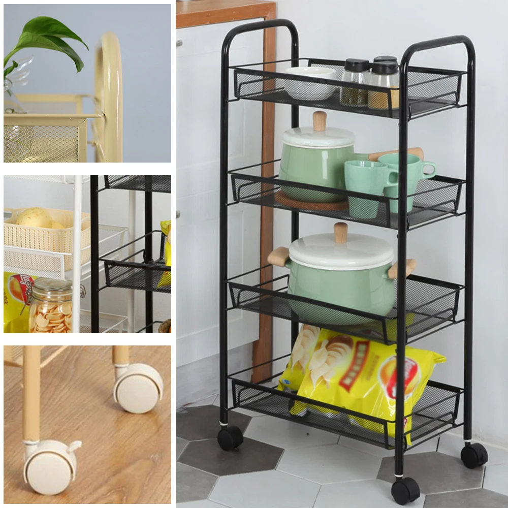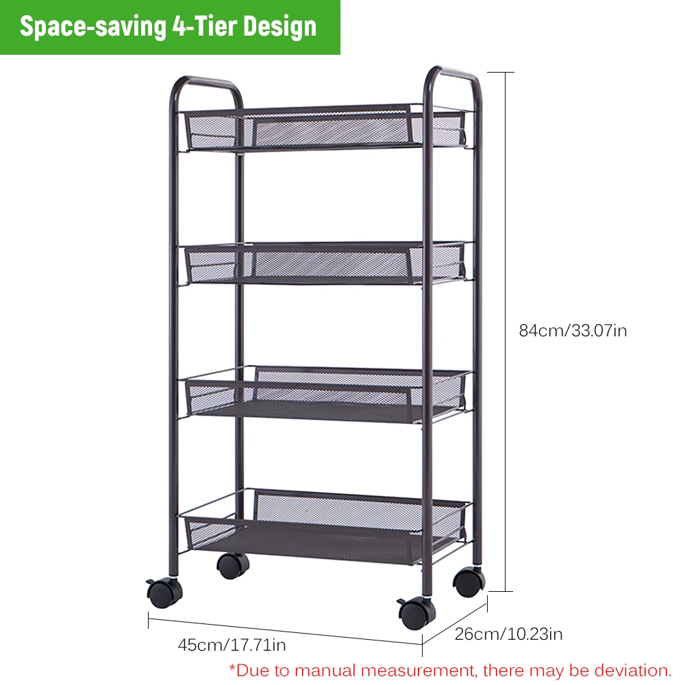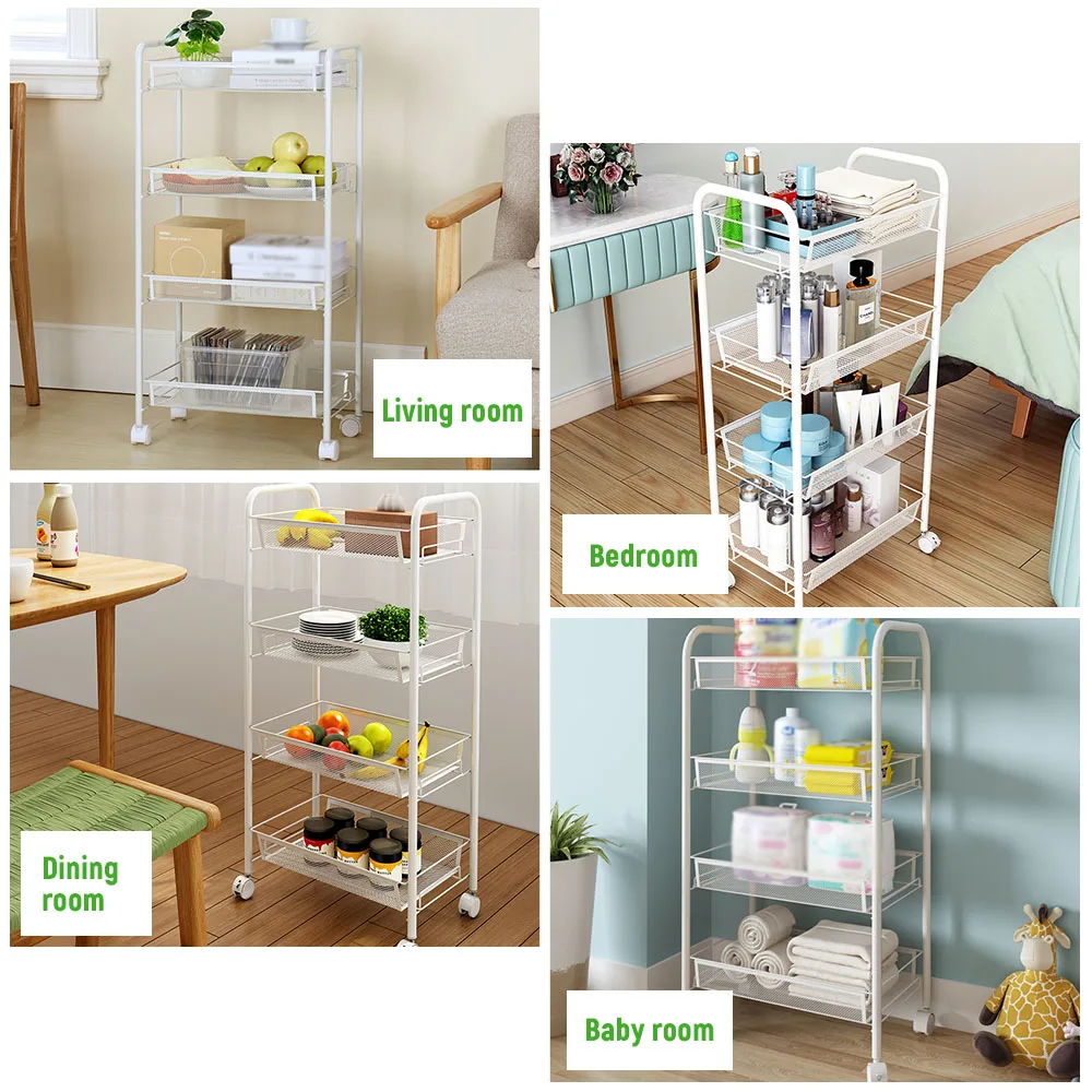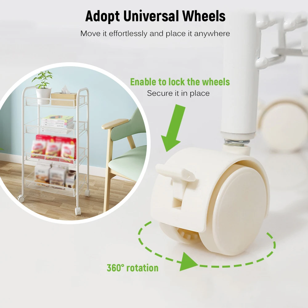 4-Tier Rolling Cart:Four layers cart takes fully advantage of space without occupying too much floor space; four easy-glide universal wheels on the cart make you move this cart effortlessly and place it anywhere you want. And you are able to lock the wheels to secure it in place.