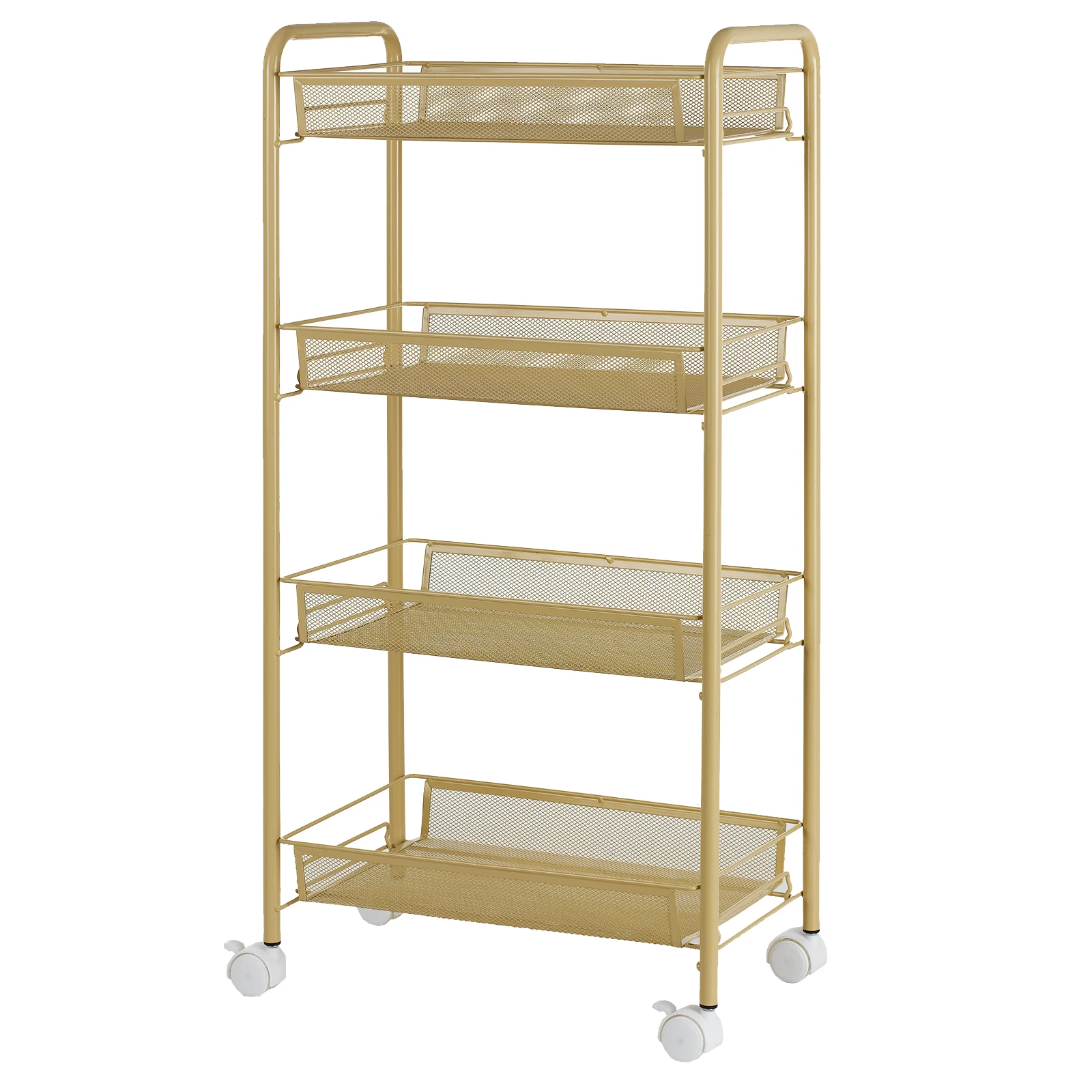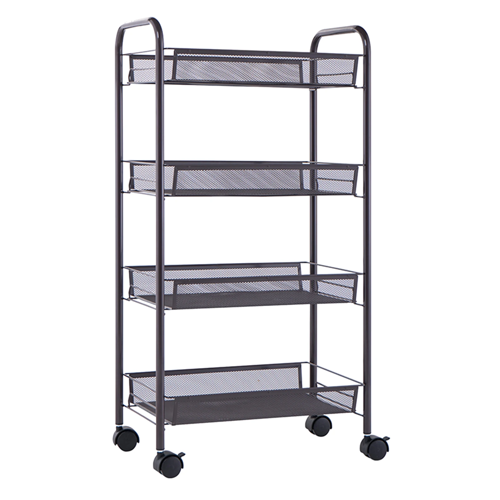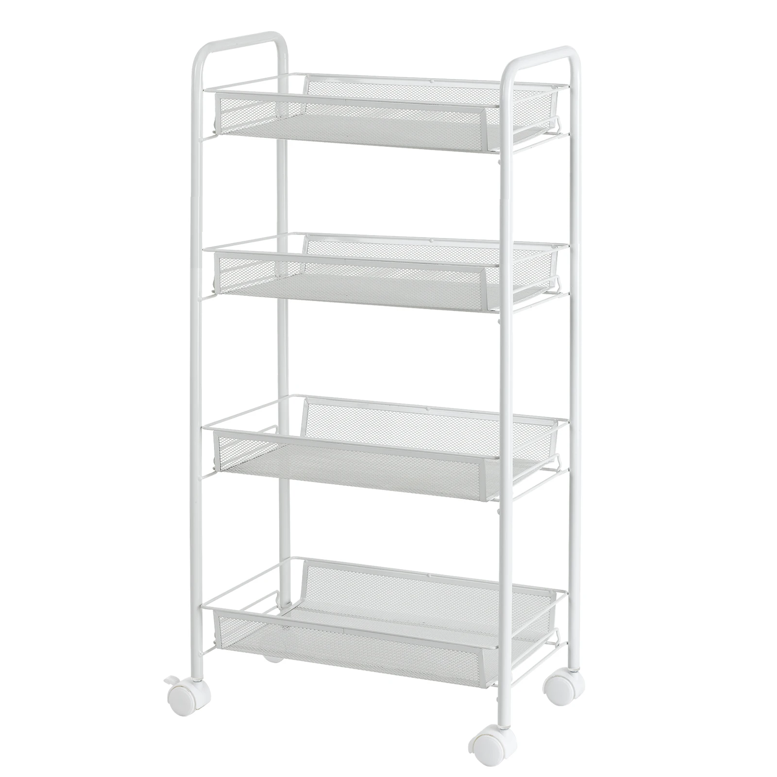 4-Tier Rolling Cart:Four layers cart takes fully advantage of space without occupying too much floor space; four easy-glide universal wheels on the cart make you move this cart effortlessly and place it anywhere you want. And you are able to lock the wheels to secure it in place.