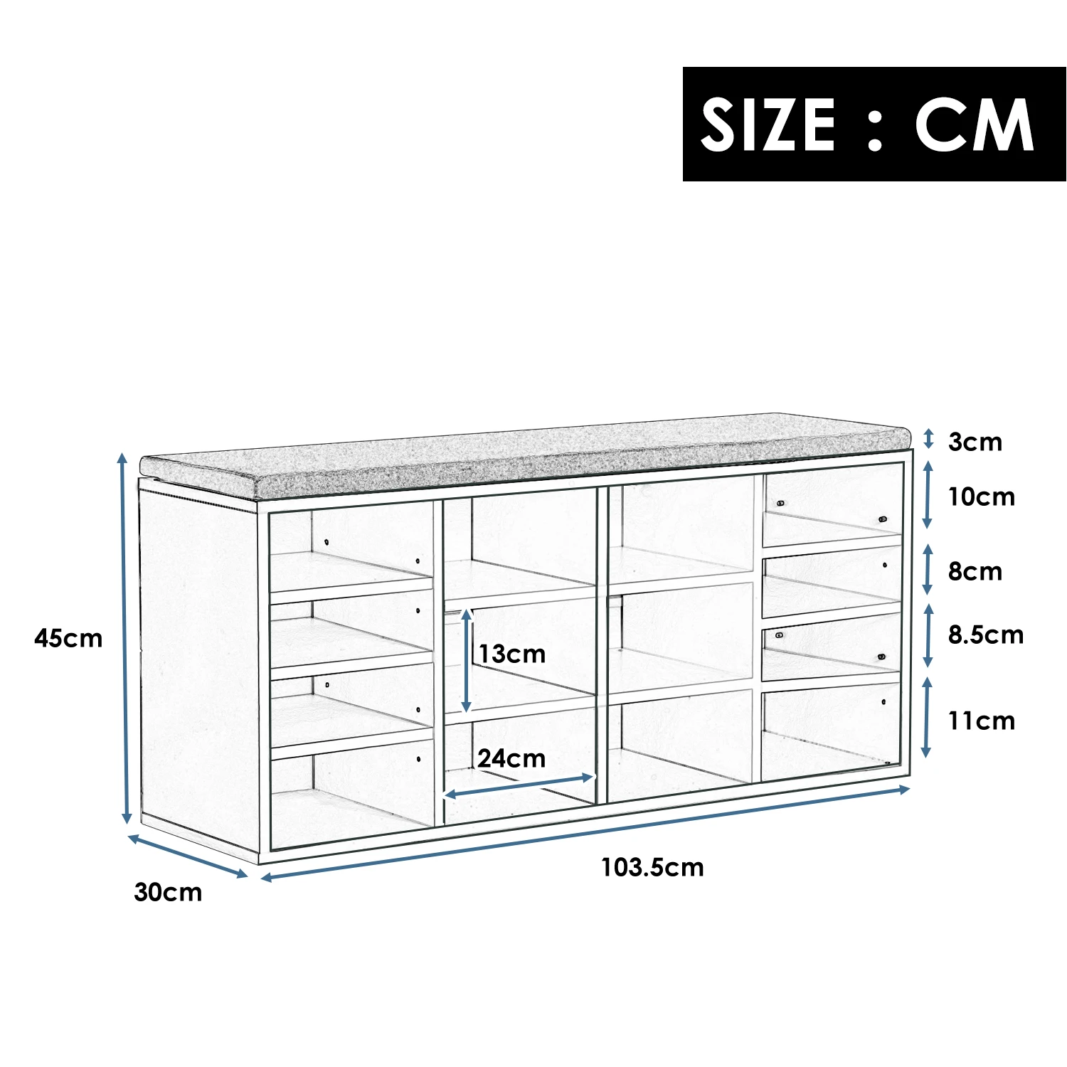 【 Высокое качество 】этот шкаф для хранения со съемной подушкой изготовлен из высококачественной ДСП, которая соответствует стандарту E1 градусов, имеет вес подшипника до 150 кг. Эта Подушка наполнена губкой и покрыта хлопковой тканью, которая делает ее дышащей и легкой в чистке 【Variable】вы принимаете решение о высоте отсеков, например, для ботинок или сумок. 14 сеток для организации ваших изделий различных размеров, таких как одежда, обувь, ботинки и т. д. подходит для небольшого пространства, прихожей, спальни, веранды. 【Большая Емкость 】 этот шкаф может хранить до 18-24 пар обуви в зависимости от размера обуви 【Прочная конструкция 】 ДСП панели шкафа для обуви крепятся мебельными замками, которые обеспечивают большую стабильность; Легкий уход и устойчивость к царапинам шпон для поверхности 【Размеры 】 103,5x30x48 см (Ш x Г x В). Вес: 24 кг. Вес подшипника до 150 кг;