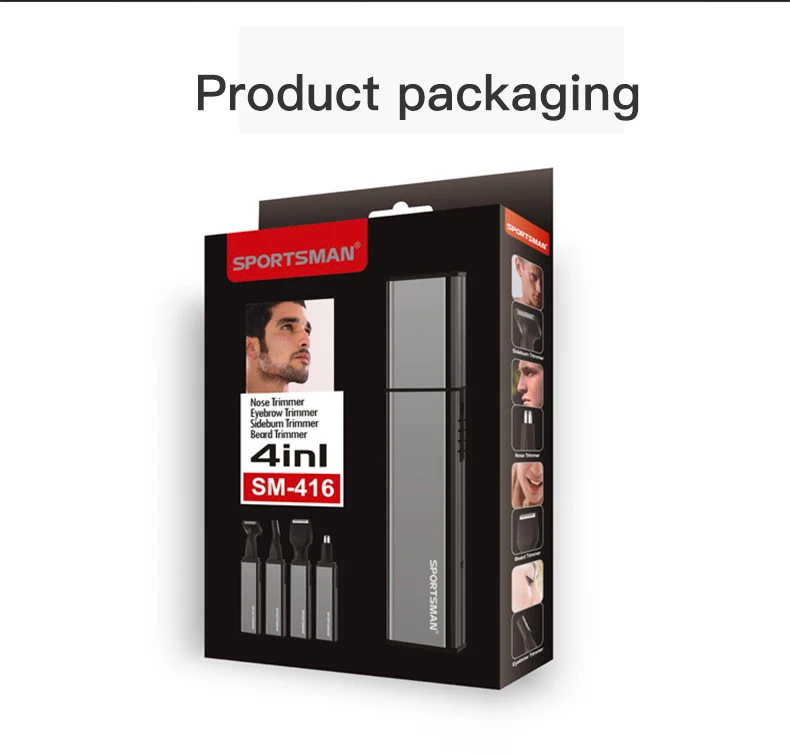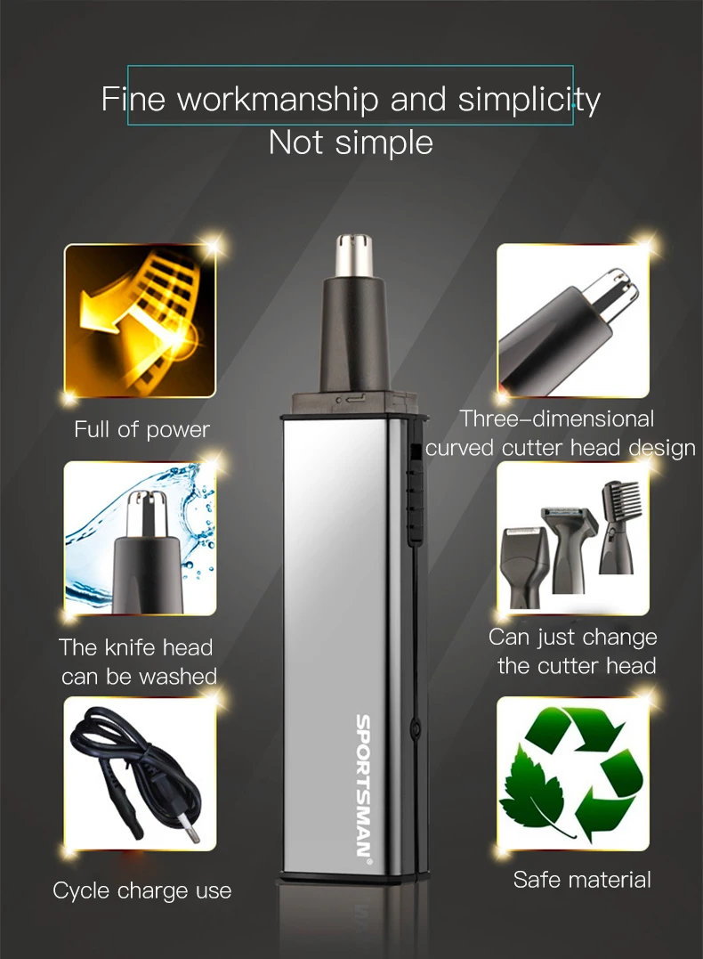Название продукта: набор триммеров для носа @ бренд: SPORTSMAN @ Модель: @ Разъем: USB @ Время зарядки: 5 часов @ напряжение: USB DC 5 в @ мощность: 3W @ Размер цветной коробки: * 13 * @ Вес (включая аксессуары для цветной коробки): g @ Вес машины: 83g @ Размер машины: * @ Стирка: для мытья режущей головки, для тела не моющийся набор @ режущая головка: для волос в носу, для бритья, для коррекции бровей, для бакенбардов @ Тип батареи: Встроенный никель-водородный аккумулятор ()