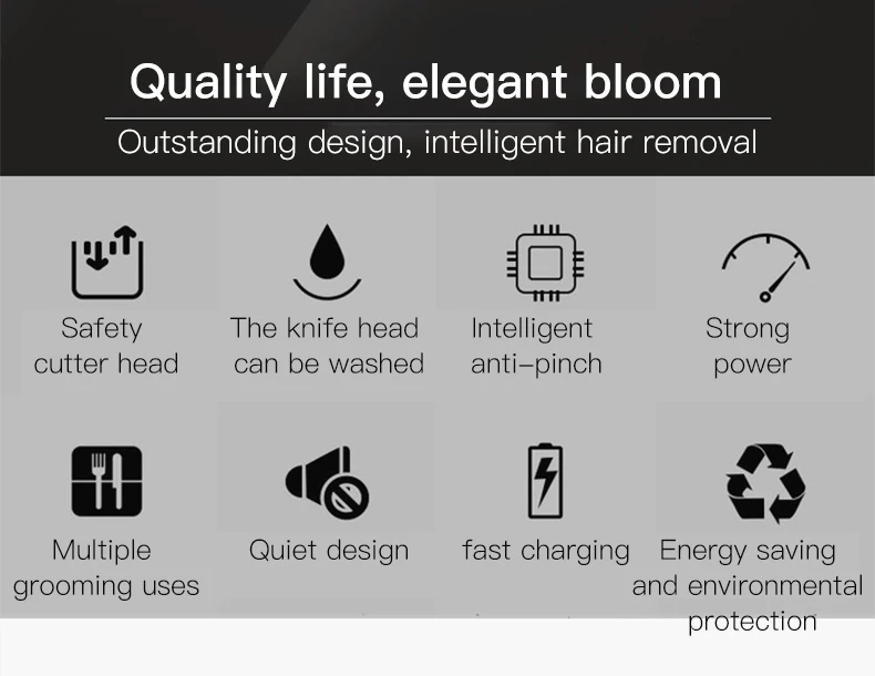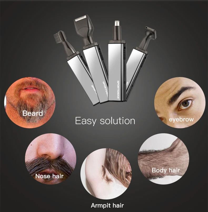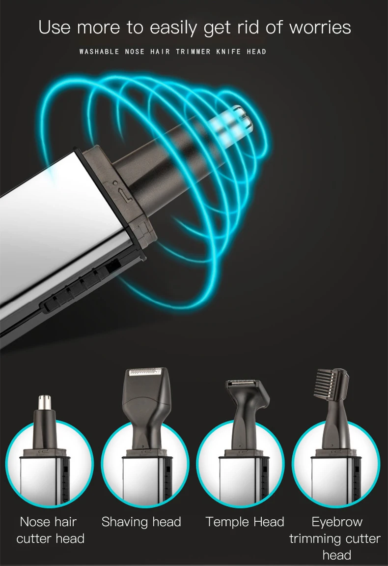 Посылка: @ 1x устройство для волос в носу хост @ 1x головка для бритвы @ 1x формовочный нож для бровей головка @ 1x Головка ножа в виде бакенбардов @ 1 кабель для зарядки USB @ 1x щетка для очистки @ 1x руководство