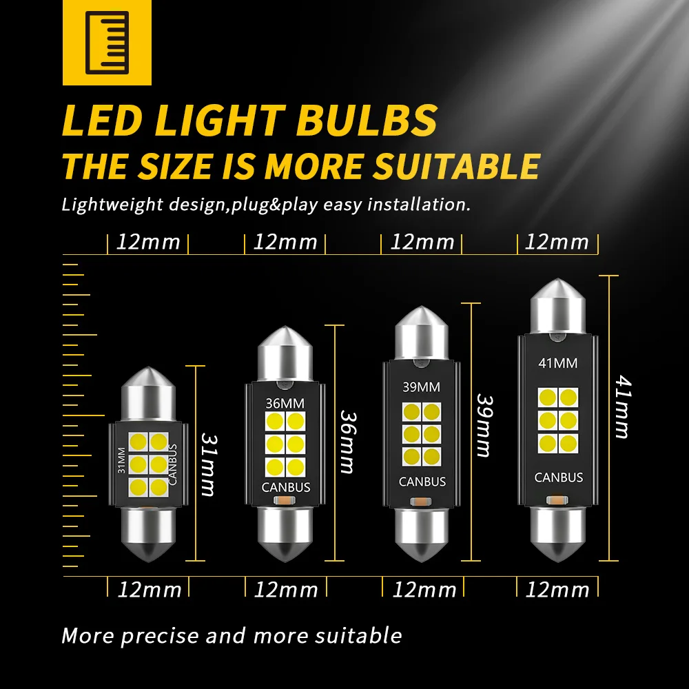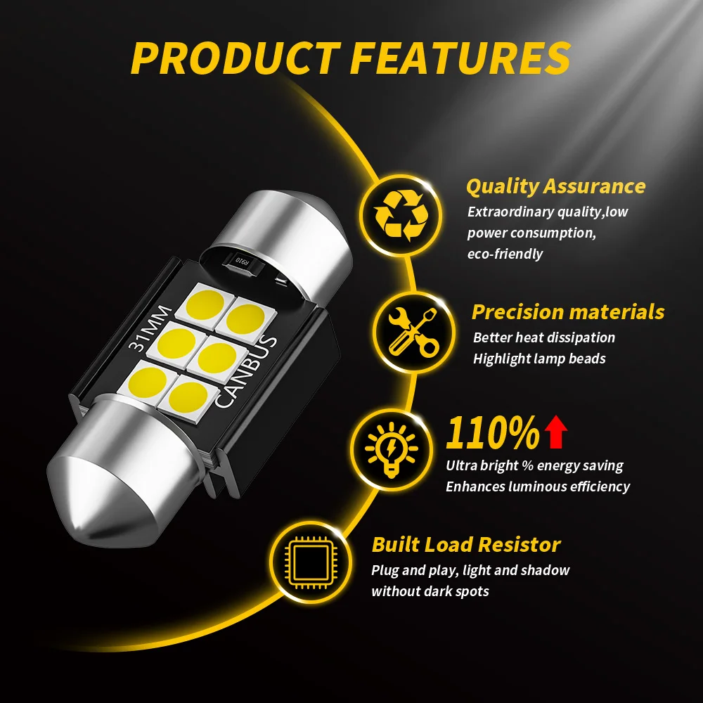 -Использование чипа высокой мощности 3030 -Новый светодиодный светильник, который снижает энергопотребление на 40% до 80%. -Алюминиевый чехол, высокая теплопроводность и красивый внешний вид. -Загорается в течение микросекунд и быстро реагирует. -Светодиодный светильник, 1 Вт эквивалентен 5 Вт традиционных фар. -Светодиодный лампы имеют широкий и длительным сроком службы и Продолжительность жизни 50000 часов. -Простота установки, просто подключите и играйте. -Применимо: купольный светильник/светильник для чтения/Автомобильный внутренний светильник/дверной светильник/внутренний светильник