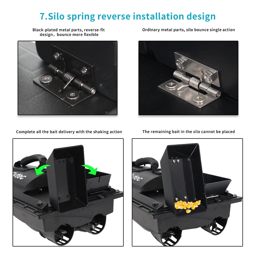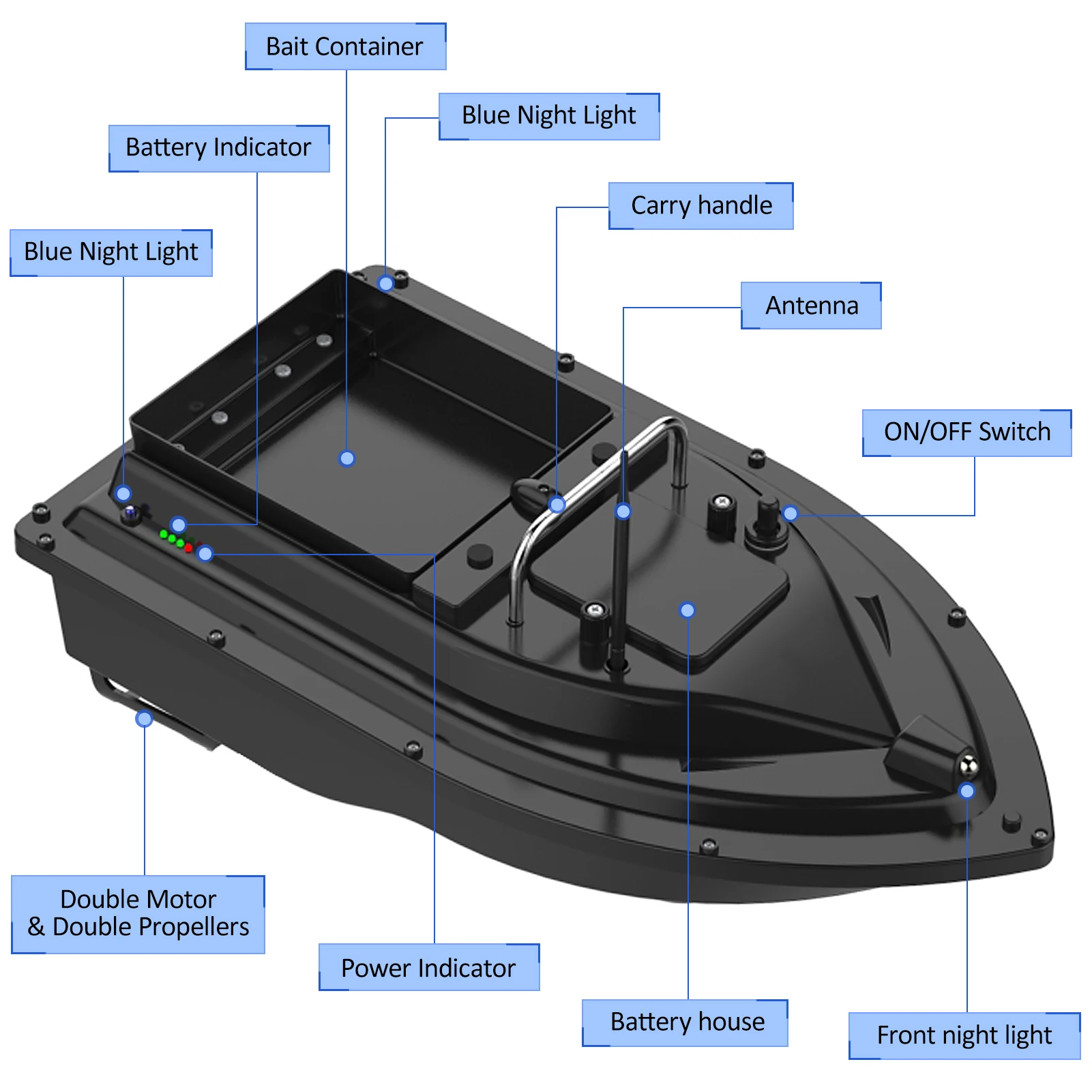 Беспроводное управление с функцией GPS, позволяет выпустить приманку далеко в озере, речке и резервуарах. 3. Контейнеры для наживки могут вместить около 4,4 фунта приманки для ловли игровой рыбы. Легкое управление для любителей рыбалки или начинающих, а также приятно для детей.