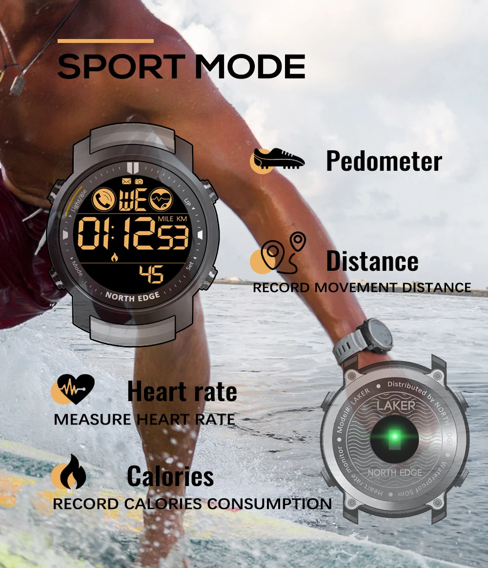 Цифровые спортивные часы NorthEdge 50 м, водонепроницаемые часы с пульсометром, шагомером, секундомером, часы Laker, мужские спортивные часы