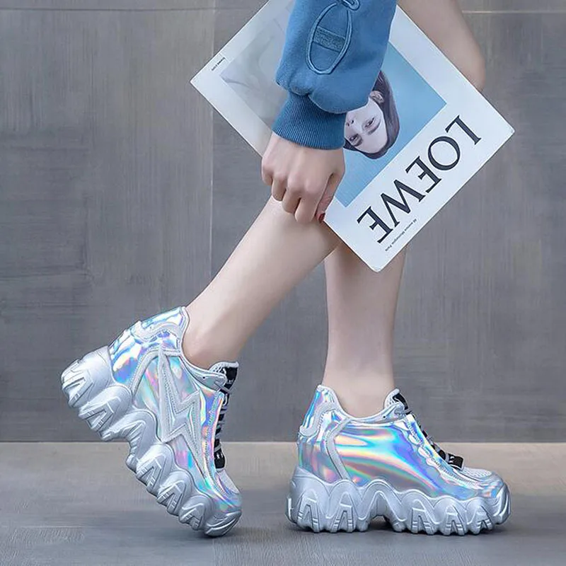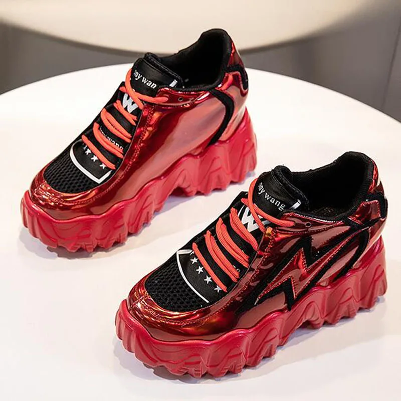 Модная обувь на шнуровке, визуально увеличивающая рост; Цвет серебристый, красный, черный; Женские лоферы на высокой платформе; Женская обувь на высокой танкетке 2020 года; Женские A18-16