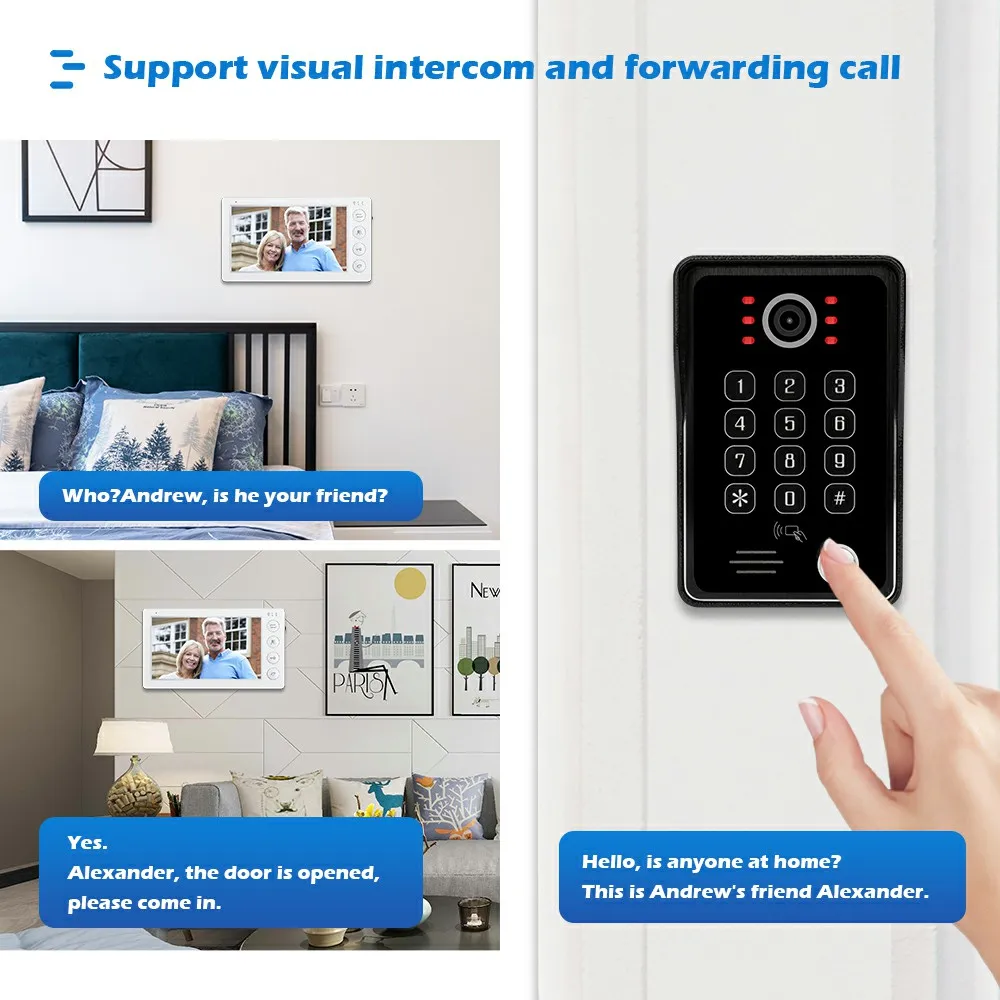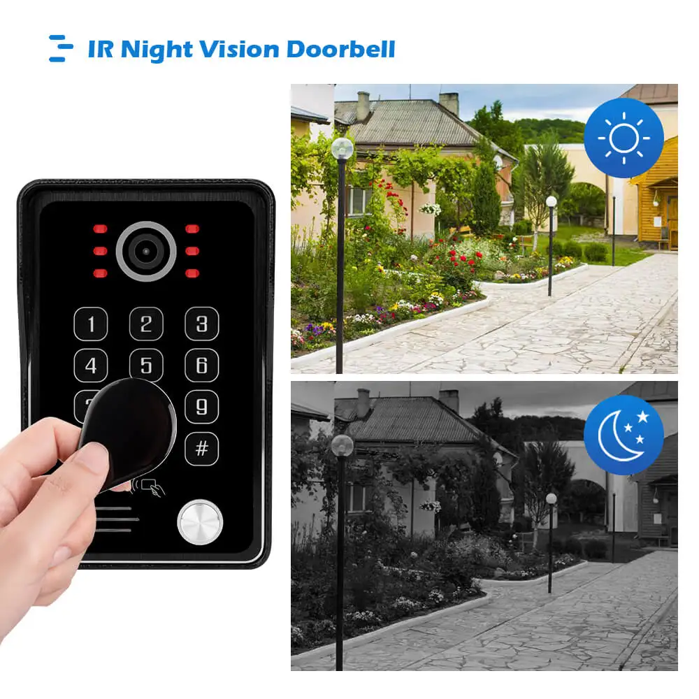 🔑Кнопка разблокировки монитора может работать при мониторинге и разговоре. 🏷️Дверной звонок поддерживает разблокировку карт IC до 200 шт. 🔢Дверной звонок поддерживает до 200 паролей для разблокировки.