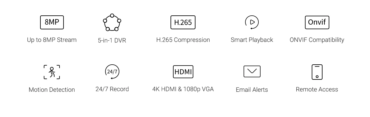 · 4K(8 Мп) Просмотр в реальном времени высокой четкости, запись и воспроизведение · 16CH Аналоговый и 16 CH IP Камера iuput одновременно · До 32-канальных ip-входов камеры (до 8 МП) · H.265 Сжатие видео · Поддержка TVI/AHD/CVI/CVBS/IPC вход. 5 в 1 · Поддерживает iPhone, iPad, Android Мобильный удаленный мониторинг · До 10 ТБ Емкость на HDD · Аудио через коаксиальный кабель Особенности камеры: ★4K ( 8 МП ) Камера с высокой четкостью ★2,8 мм объектив оживит картинку ★До 30 м ночное видение с умным ИК ★Четкое дневное и ночное видение с автоматическим ИК-фильтром ★Класс защиты от пыли и воды IP67