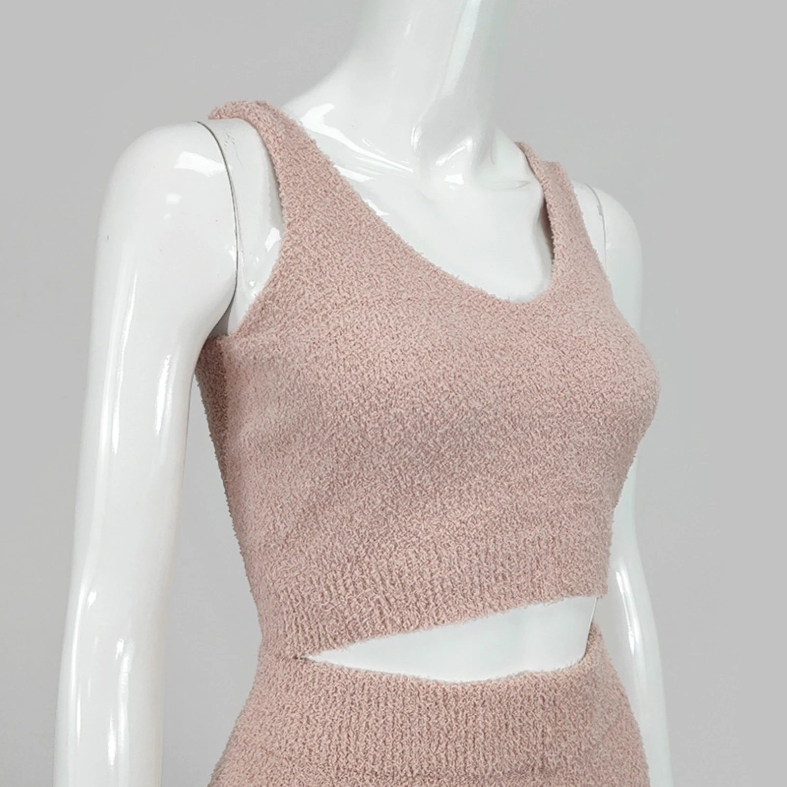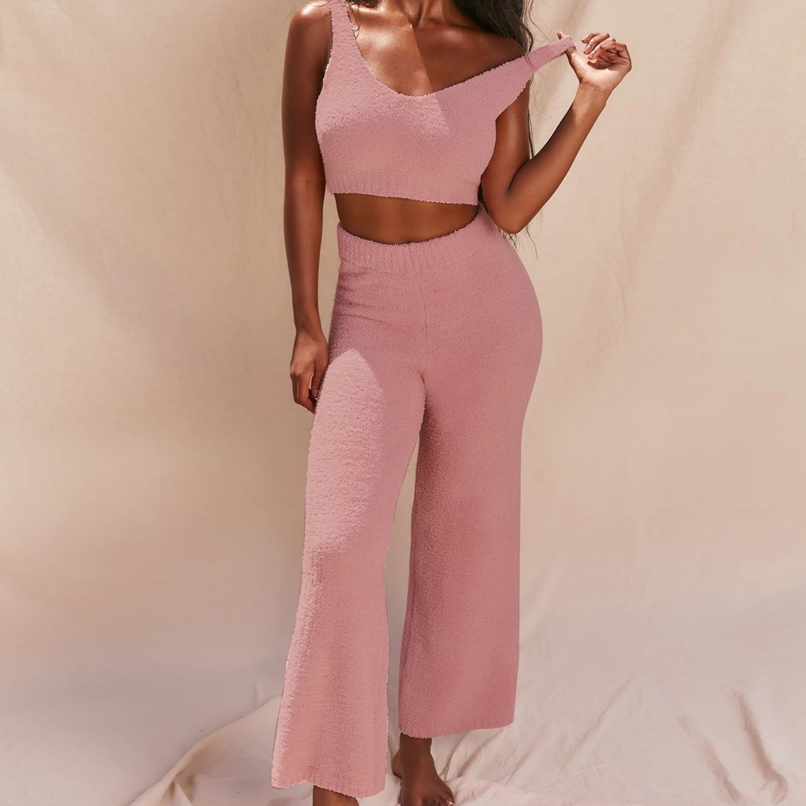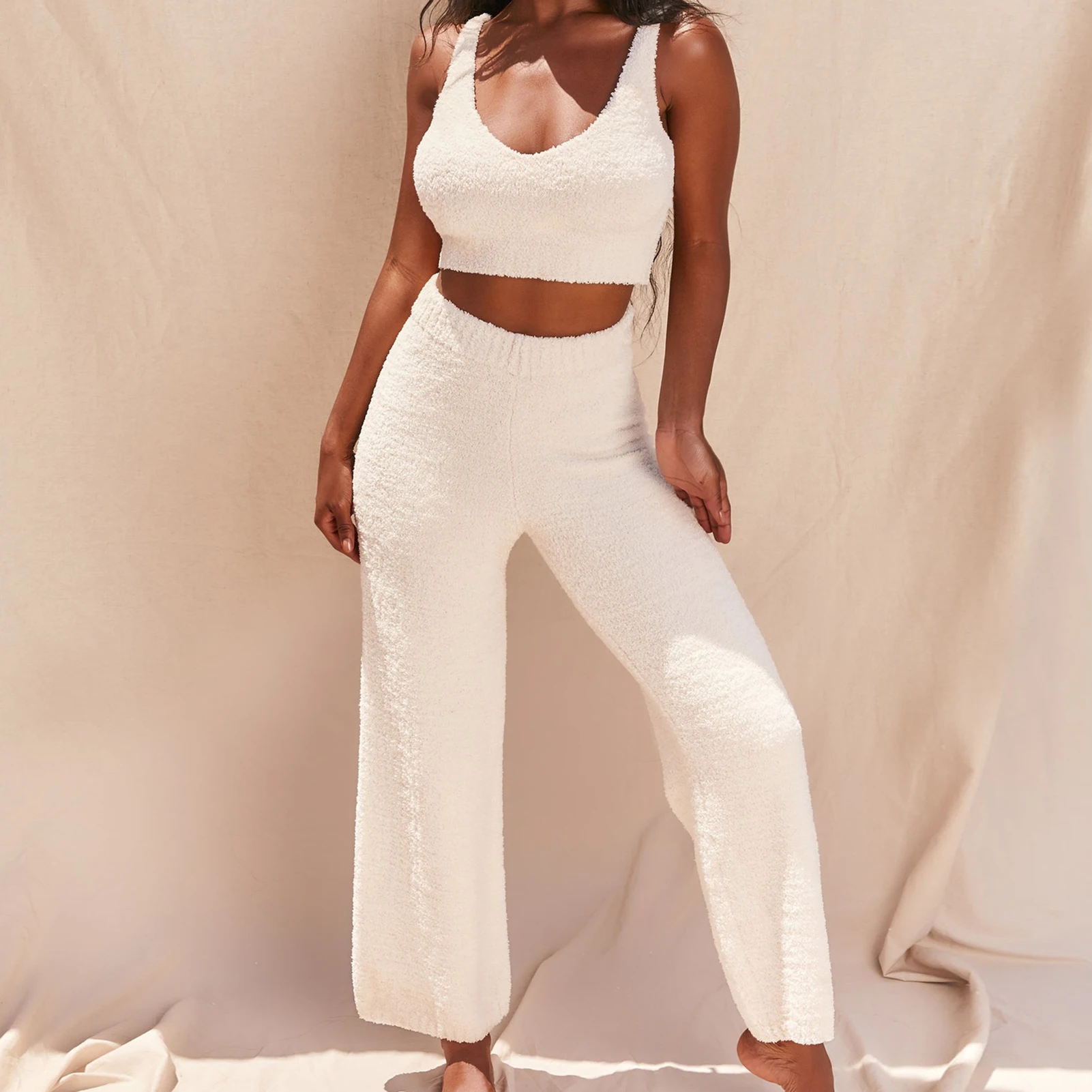 Женский Осенний укороченный топ с открытой спиной, жилет и брюки, плюшевый комплект из двух предметов, подходящий комплект