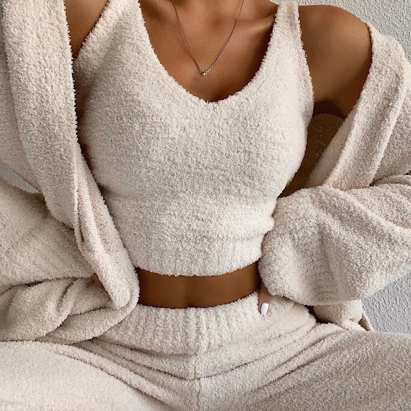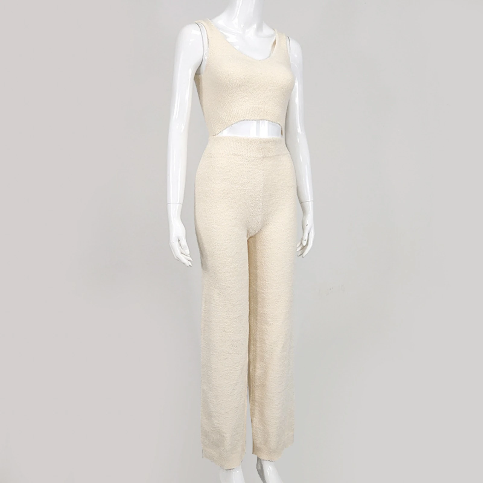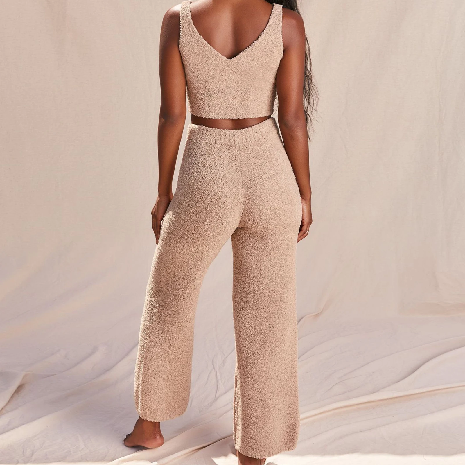 Женский Осенний укороченный топ с открытой спиной, жилет и брюки, плюшевый комплект из двух предметов, подходящий комплект