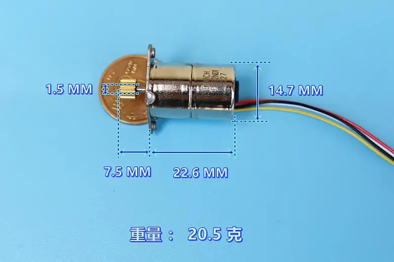 Диаметр двигателя: 15 мм Длина мотора: 22,6 мм Диаметр вала двигателя: 1,5 мм (с переключения передач из меди на нем) Длина выходного вала: 7,5 мм Режим проводки: двухфазный четырехпроводной (Красная линия: A +, белая линия: A-; Черная линия: B +, желтая линия: B-) Фазовое сопротивление: 6,6 Ом 5V Ток короткого замыкания: 0,7 A Угол шага: 18 градусов Фазовое сопротивление: 13 Ом Удерживающий крутящий момент: 50 г. См