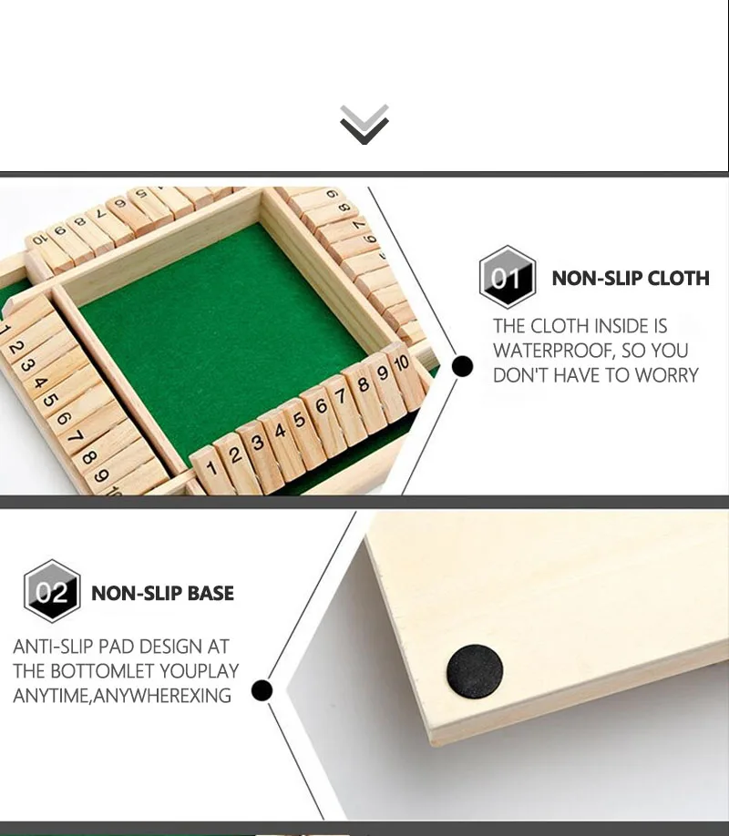 1. Игрок бросает кости в коробку, а затем добавляет точки, ориентируясь вверх на кости. Например, 5 + 2 = 7
