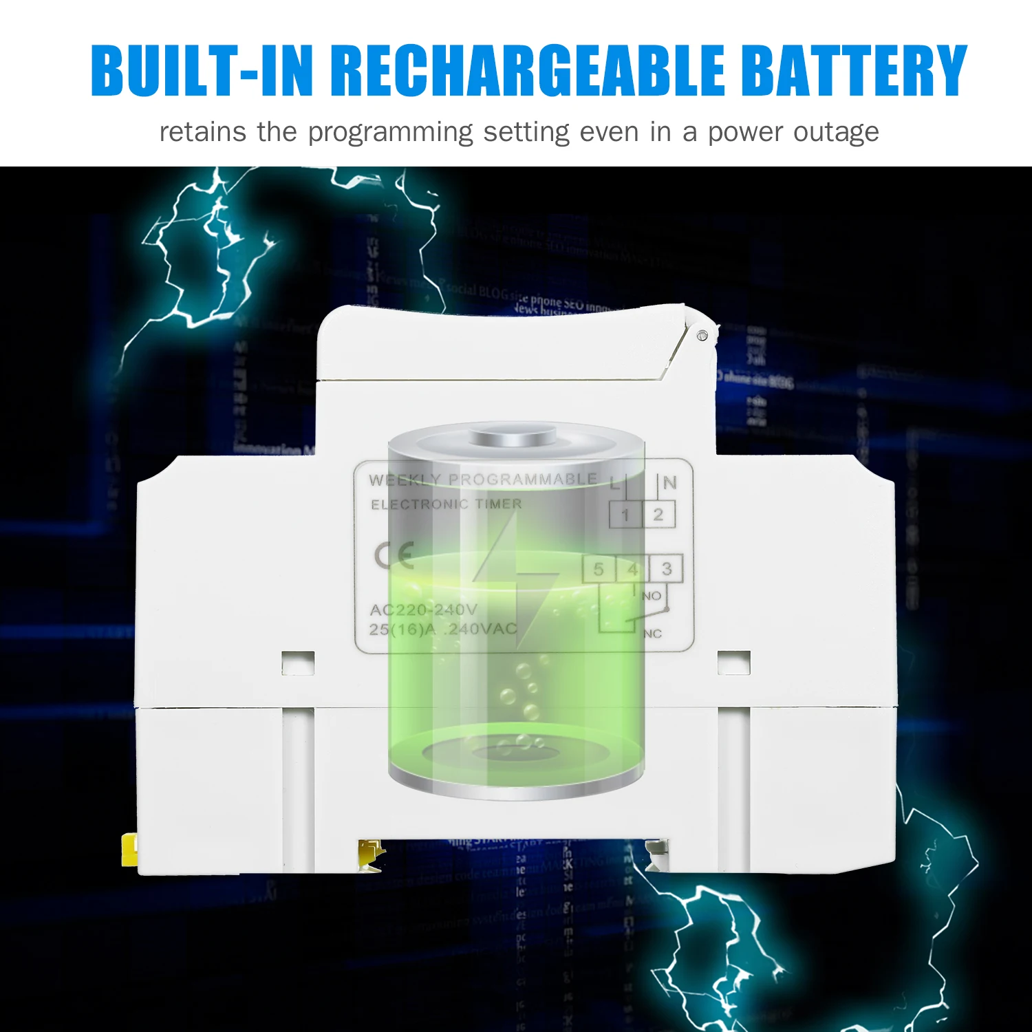 Цифровой электронный переключатель общего назначения может повторять программы с 16 включенными и 16 выключенными настройками для различных целей для гибкого планирования. Предварительная настройка за неделю до этого. Точность настройки до минуты. Встроенная перезаряжаемая батарея и интеллектуальный чип позволяют сохранять настройку программирования даже при отключении питания.