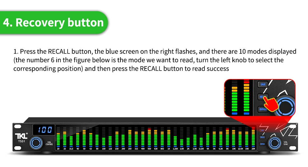 3.Байпас эквалайзераКнопка пропуска (нажмитеБайпас эквалайзераКнопка, машина не проходит никакой частотной полосы с числовой регулировкой, экран отображает «--» текущее состояние является функцией пропуска, затем нажмите, чтобы отменить функцию пропуска)