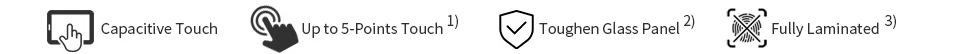 1) касание до 5 точек в зависимости от операционной системы. 2) до 6H Твердость Закаленное стекло панели. 3)Оптический скрепляющий экран, Лучший опыт отображения, защита от пыли.