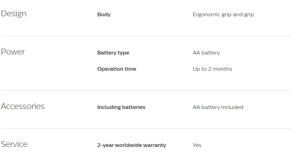 Вы можете использовать этот компактный триммер на батарейках AA, когда и где вам это нужно. Одна батарея обеспечивает два месяца использования; Время работы может отличаться в зависимости от типа волос и частоты бритья тела. Для лучшей производительности Используйте только высококачественные щелочные батарейки типа АА Philips.