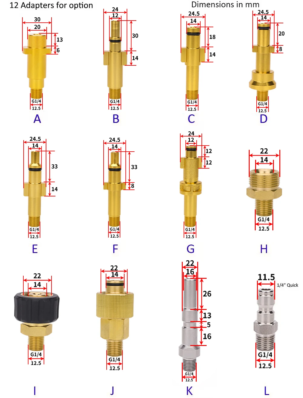 Выберите подходящий адаптер для мойки под давлением. Пожалуйста, проверьте размер адаптера и убедитесь, что он подходит для вашей машины. Мы не несем никакой ответственности за несовместимость адаптера. Если вы не уверены, пожалуйста, свяжитесь с нами и отправьте нам фотографию вашего пистолета и копья, мы поможем выбрать подходящий адаптер.