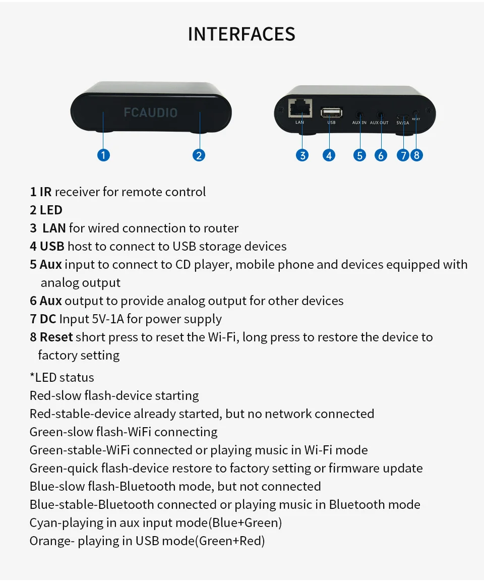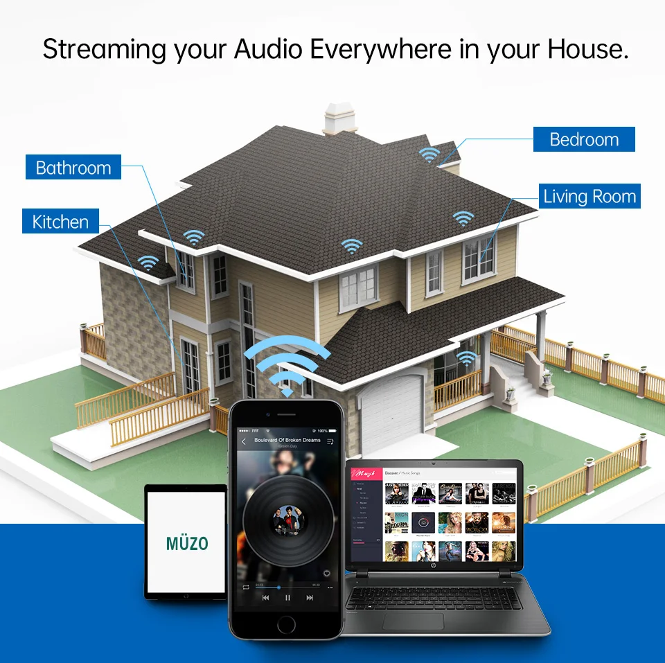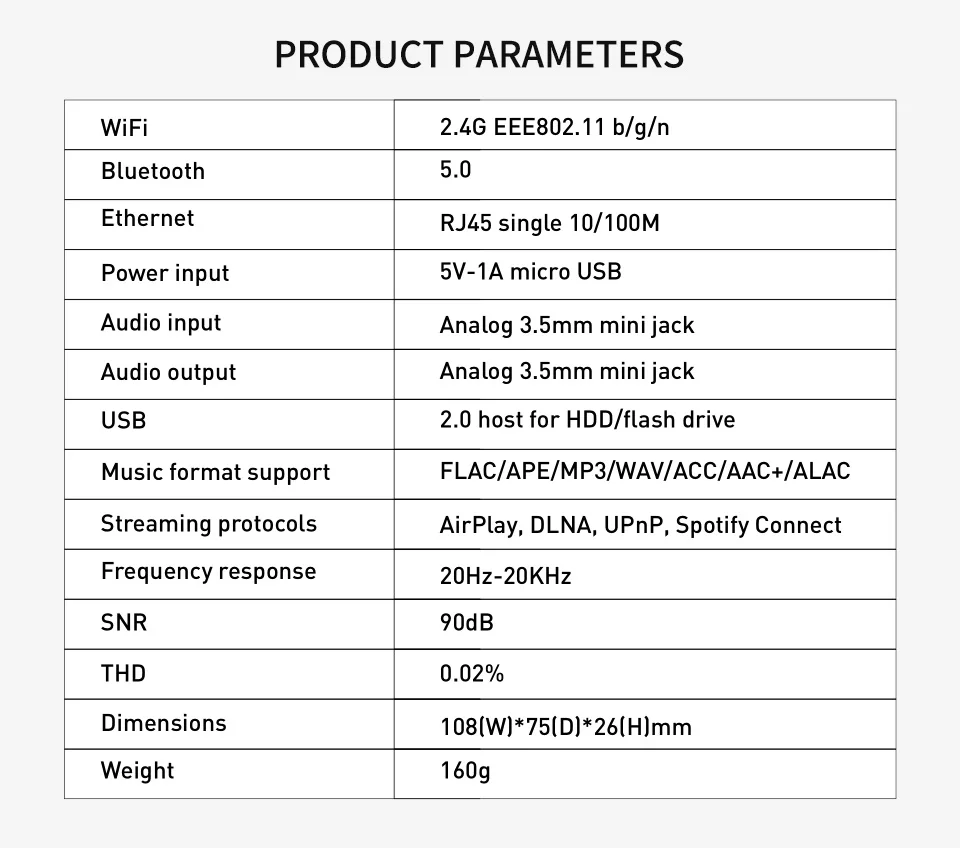 WR10-это хороший и маленький беспроводной мультикомнатный аудиоприемник. Он имеет подключение Wi-Fi, Ethernet и Bluetooth 5,0. С помощью WR10 вам будет легче передавать музыку с ваших умных устройств, USB, NAS, третьи вечерние приложения, которые поддерживают протоколы DLNA, UPnP, И онлайн потоковое обслуживание Вашей аудиосистемы. Этот беспроводной аудиоприемник поддерживает воспроизведение аудио без потерь из локального хранилища или из Tidal, Qobuz в приложении Muzo player. Еще одним Изюминкой является многофункциональная и многозональная функция для беспроводного воспроизведения одинаковой музыки во всех комнатах для синхронизации или другой музыки в разных комнатах